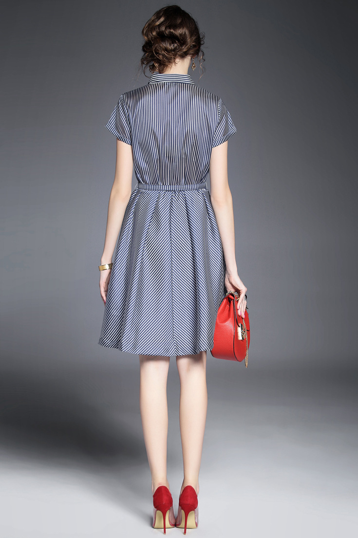 2015夏季女装 淑女气质翻领竖条纹假口袋束腰修身大摆a字裙