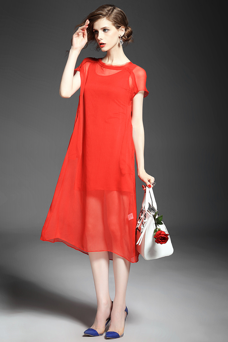 > 2015欧洲站夏季女装 时尚圆领短袖纯色气质飘逸大摆长裙修身显瘦