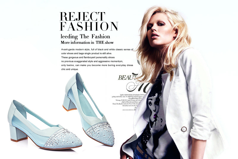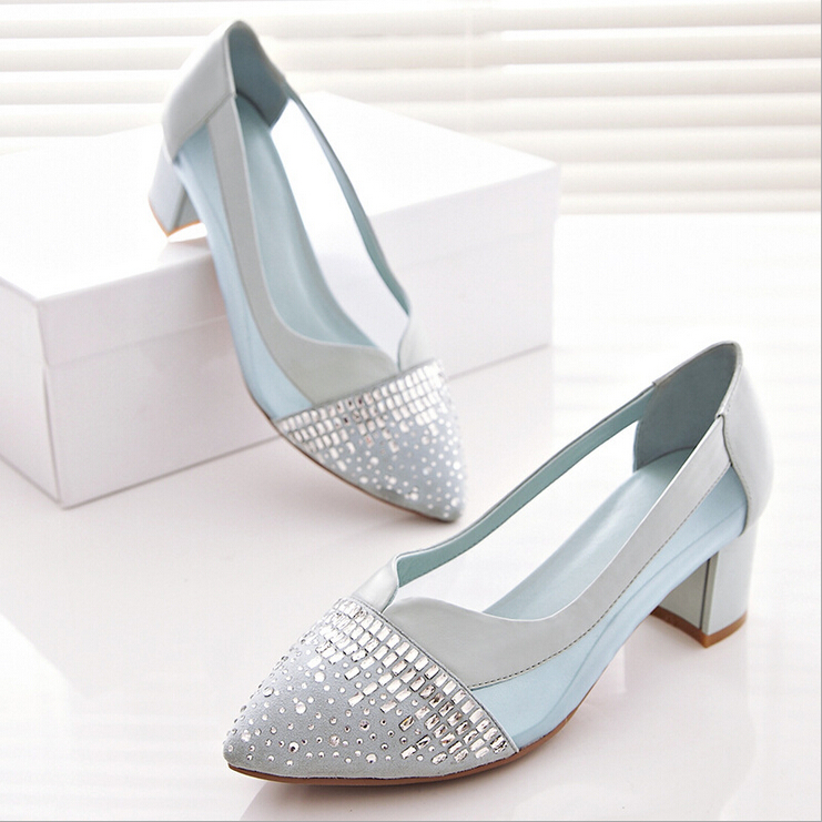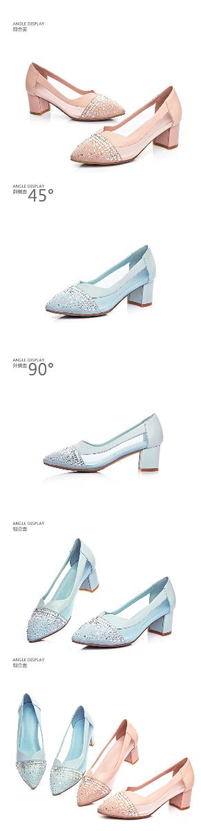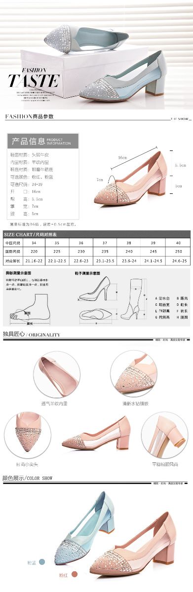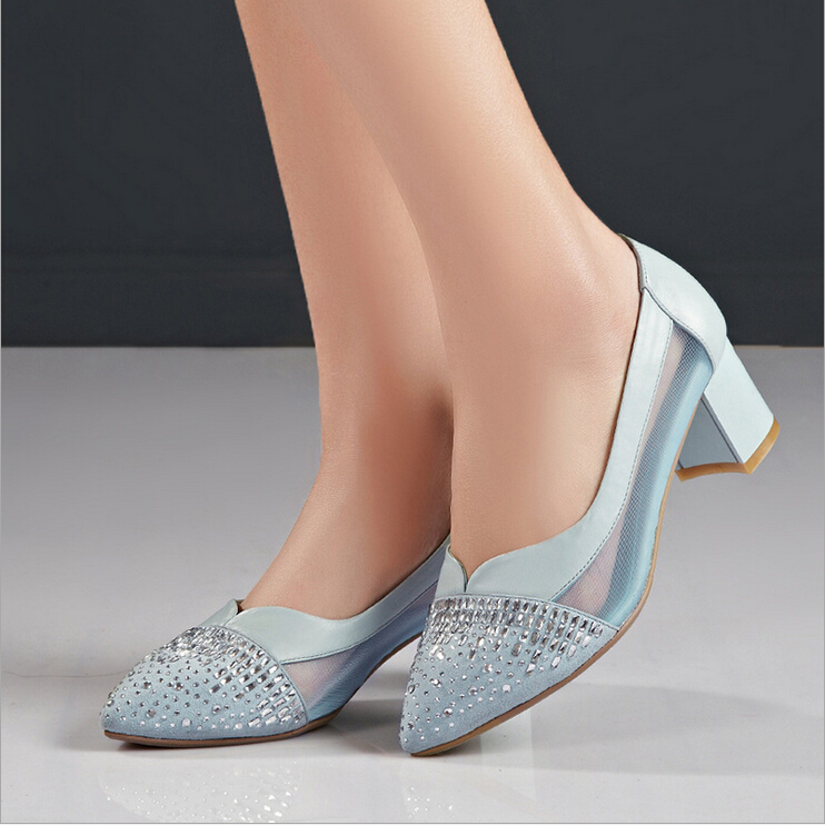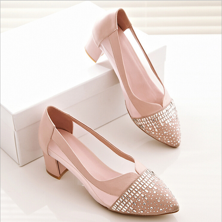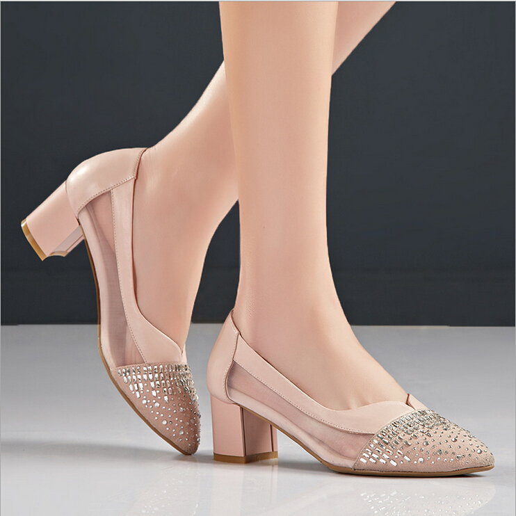 > 2015春季新款真皮女鞋欧美时尚网面拼接水钻单鞋浅口粗跟高跟鞋