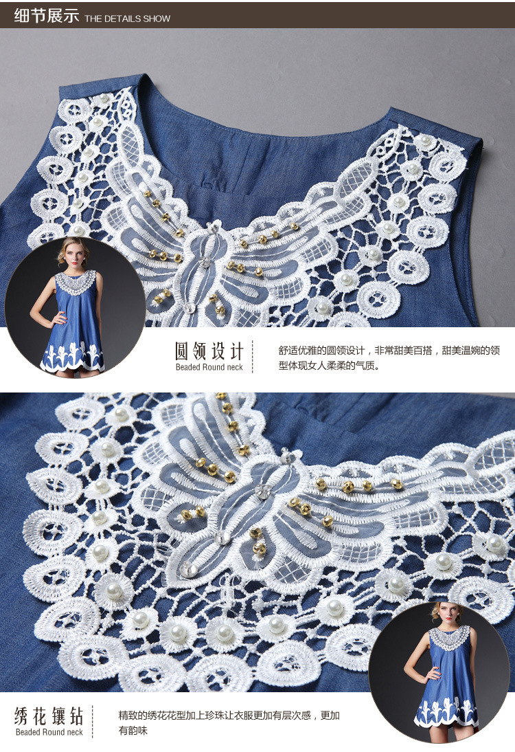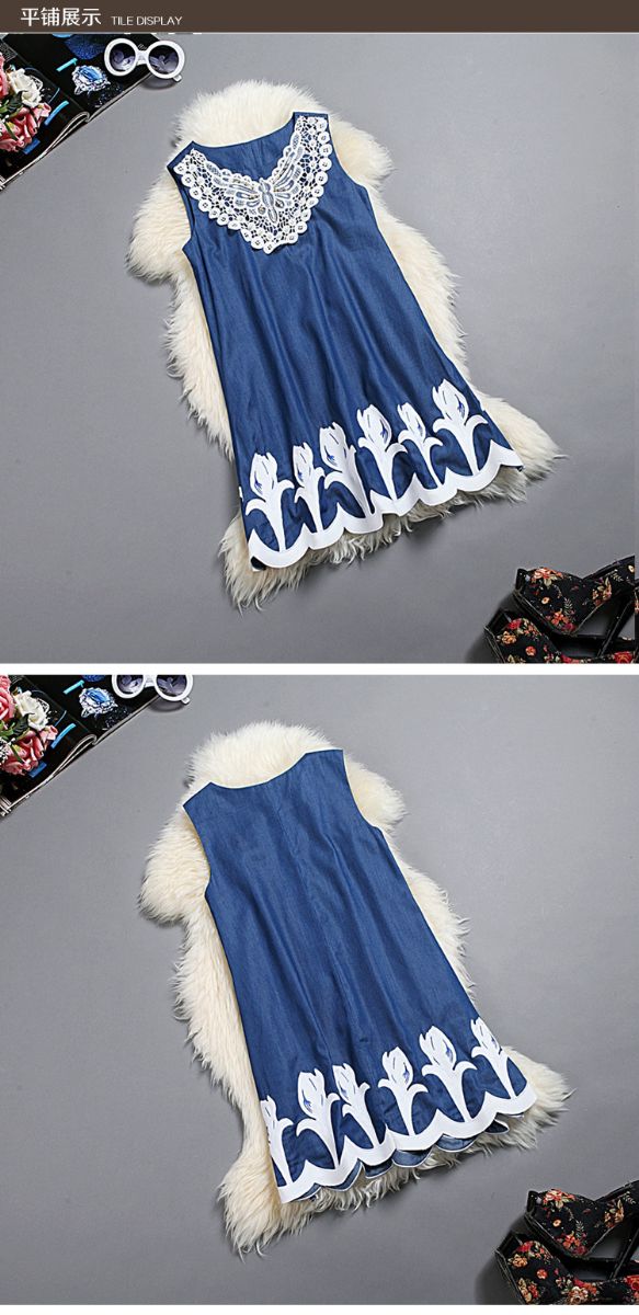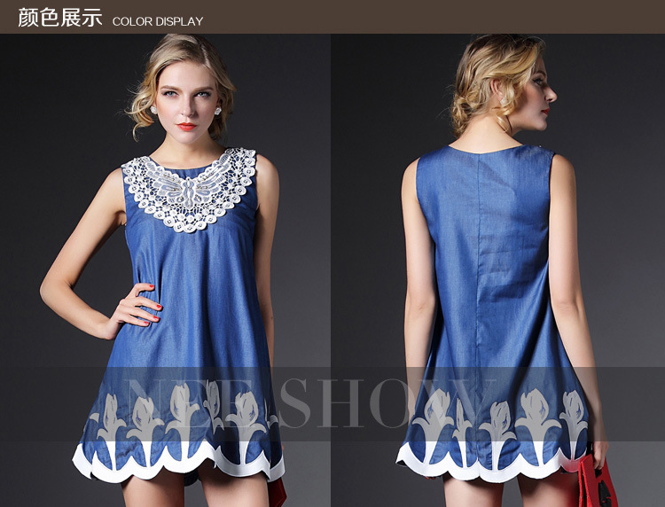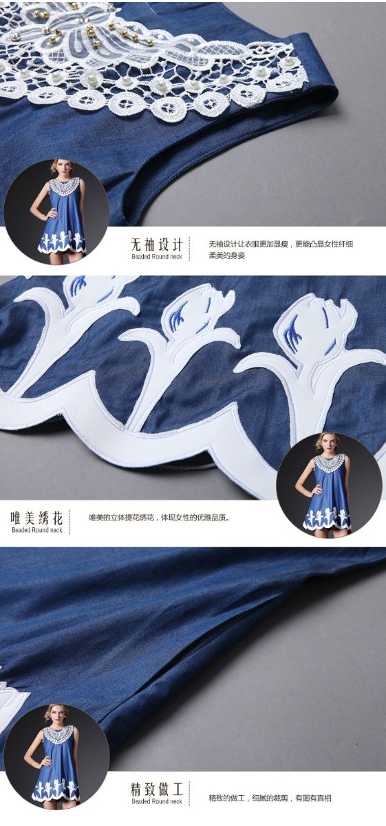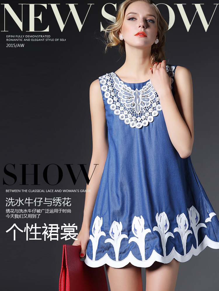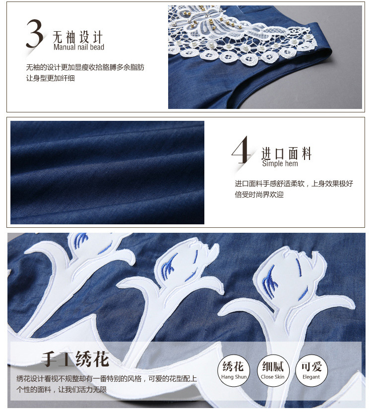 > 2015春夏新款女装连衣裙无袖V领绣花牛仔连衣裙百褶裙