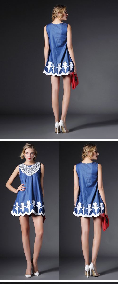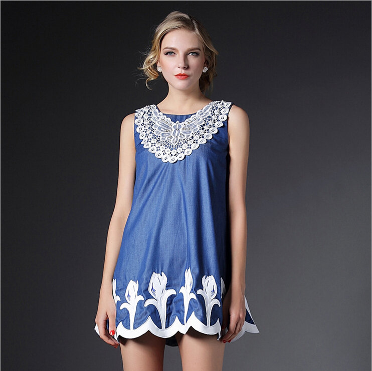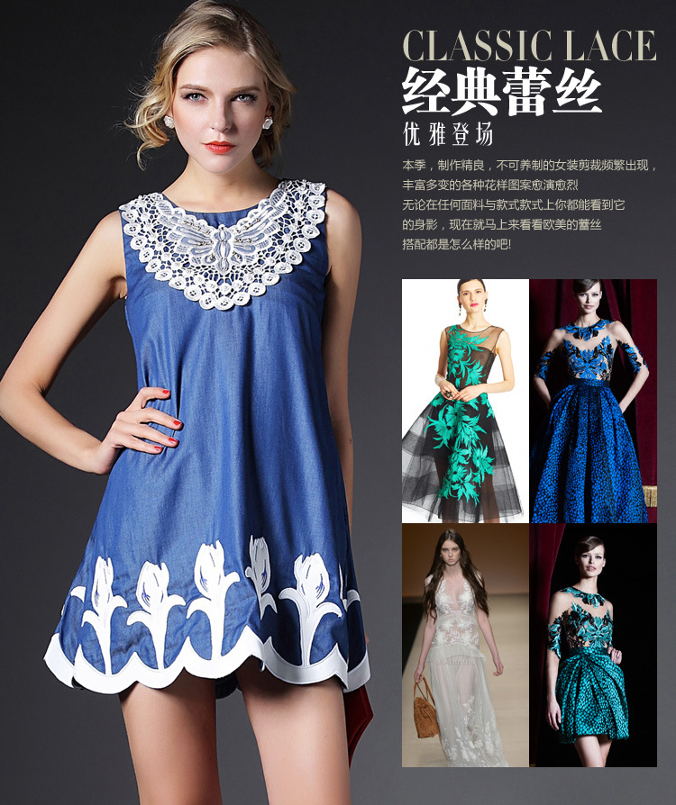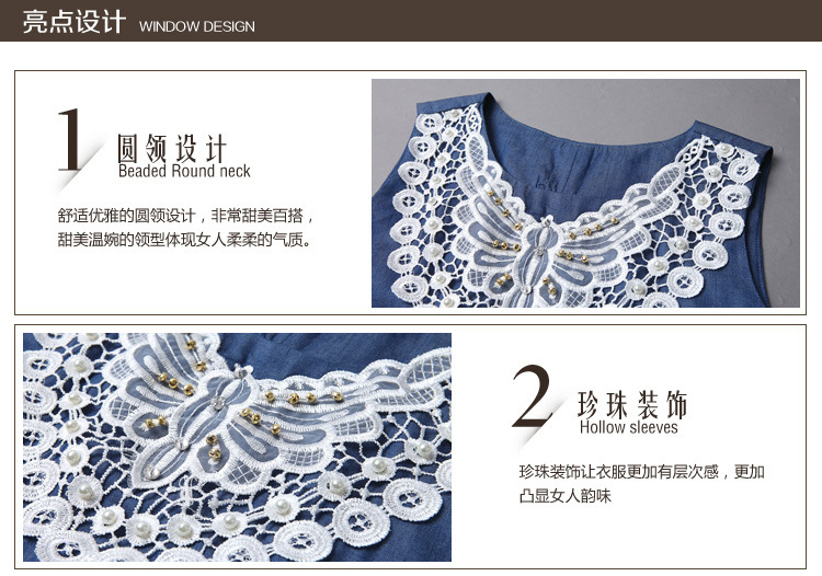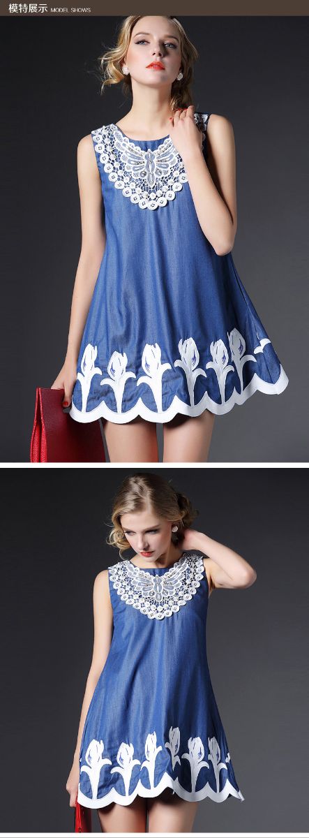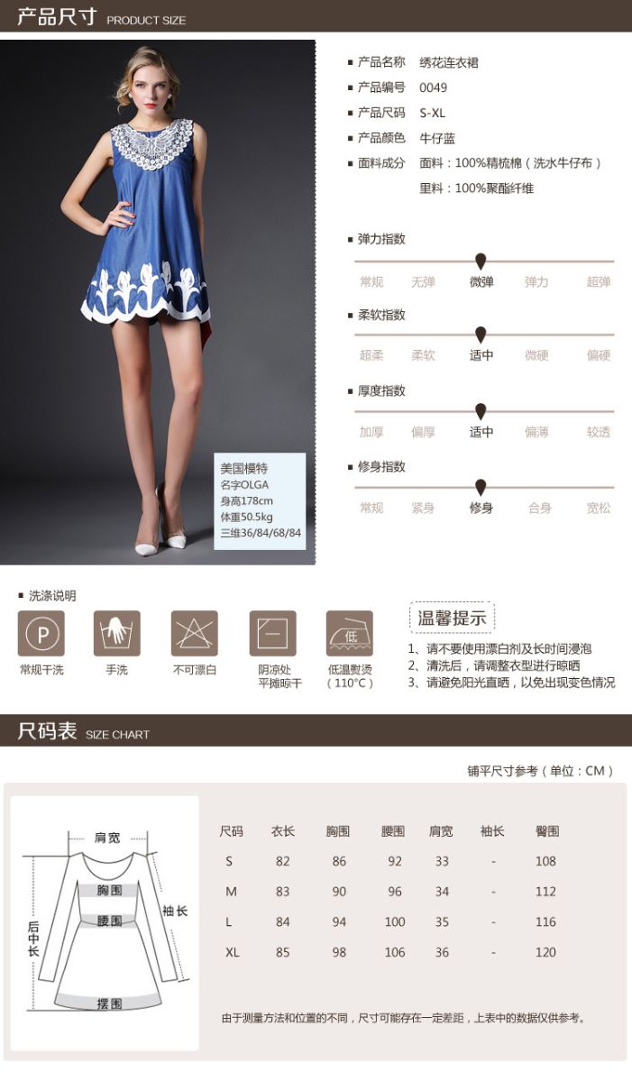 > 2015春夏新款女装连衣裙无袖V领绣花牛仔连衣裙百褶裙