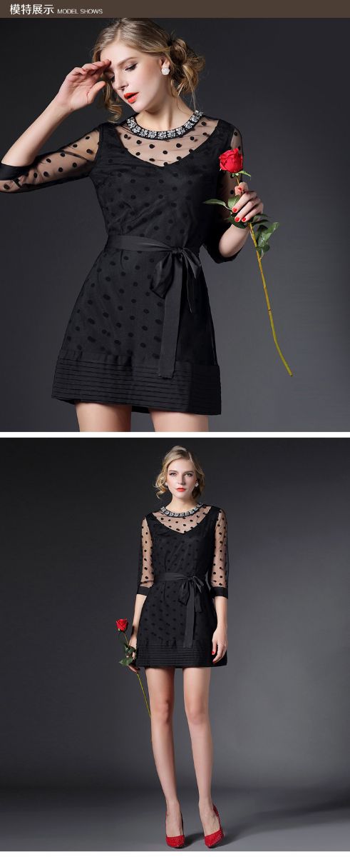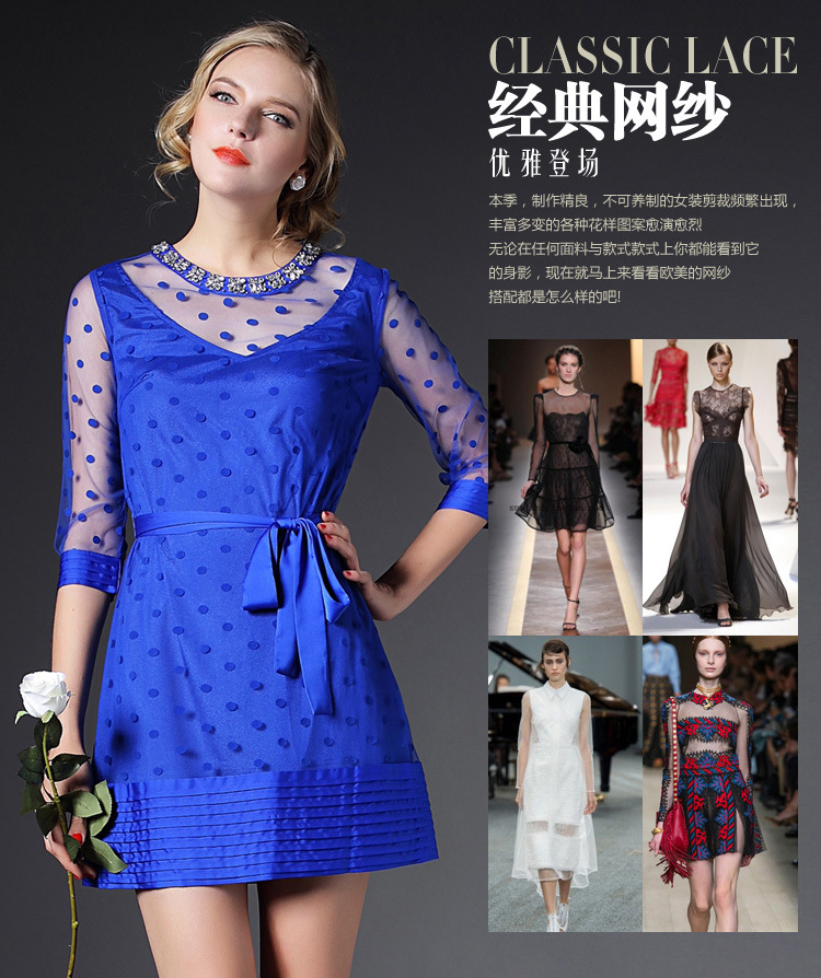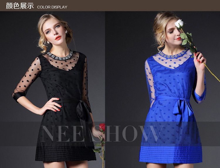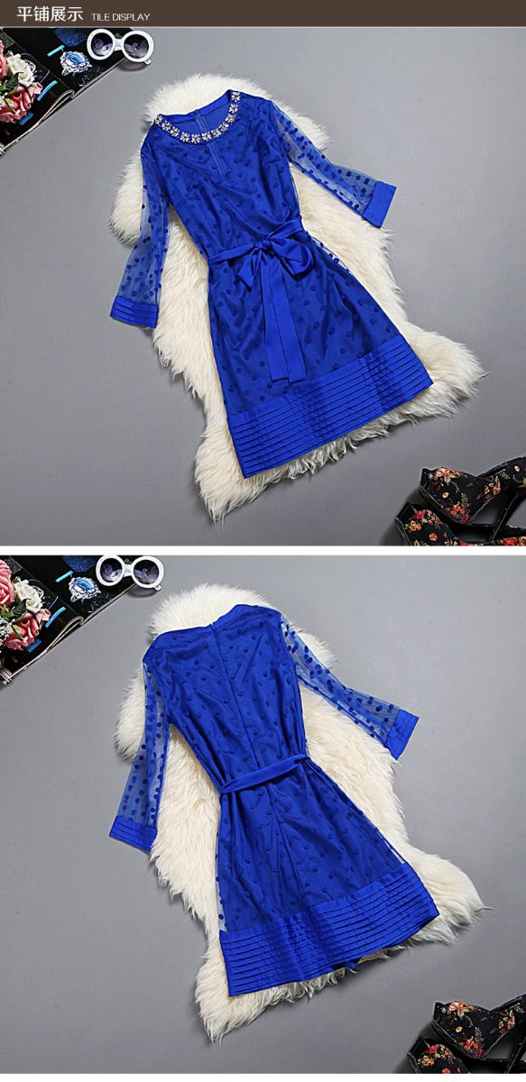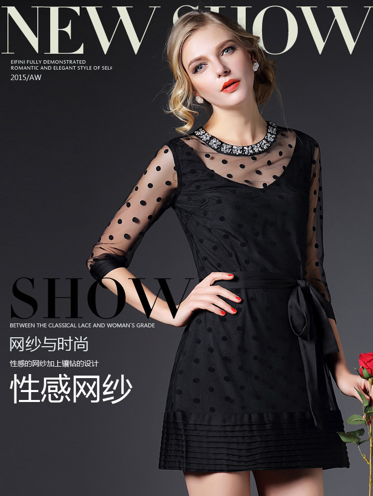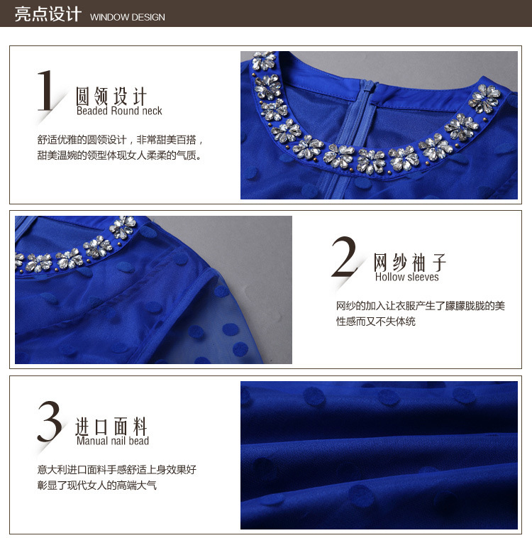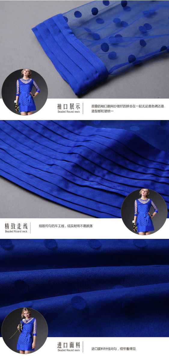 > 2015春季新款圆领透视网纱钉珠镶钻植绒修身连衣裙七分袖