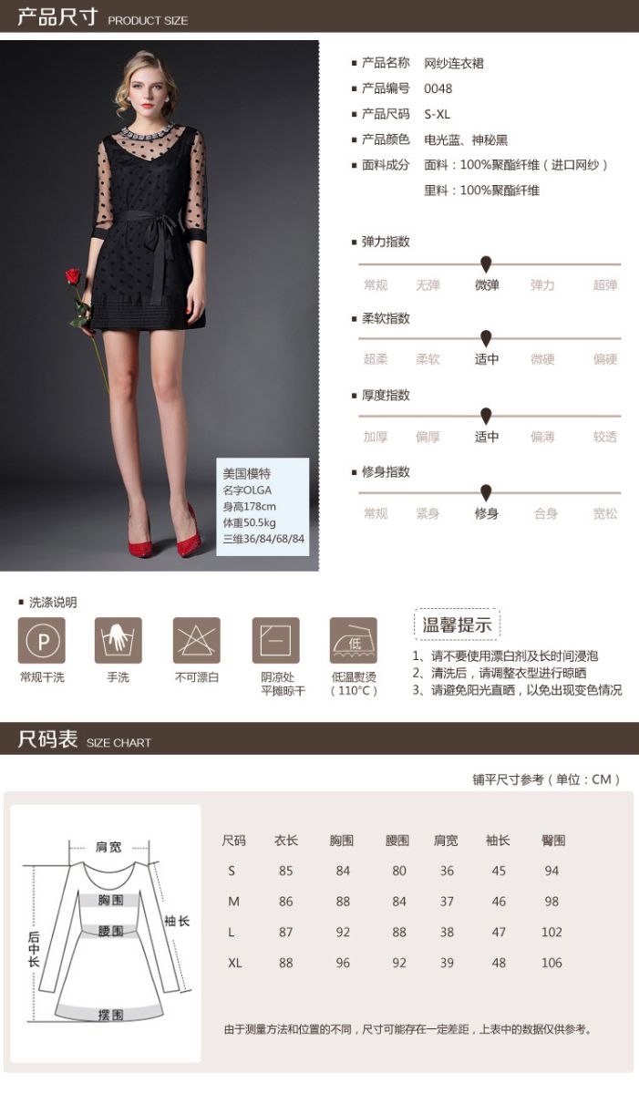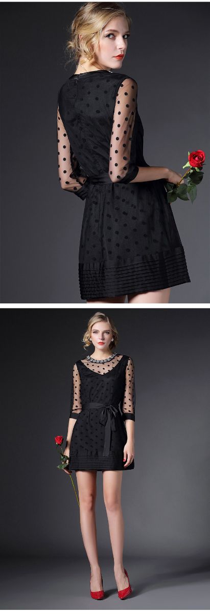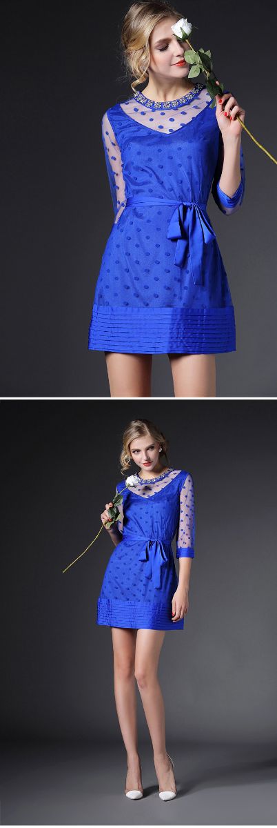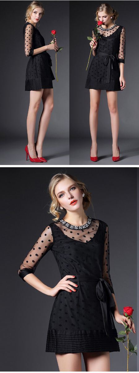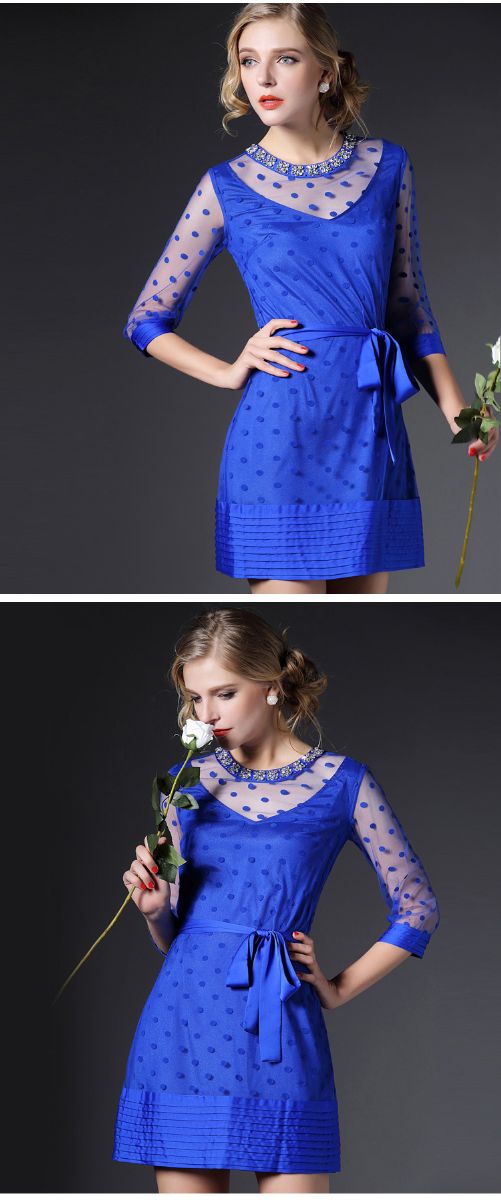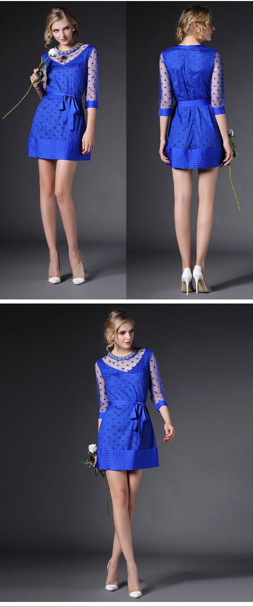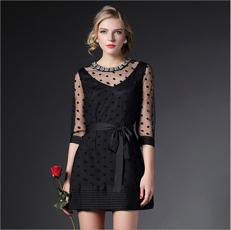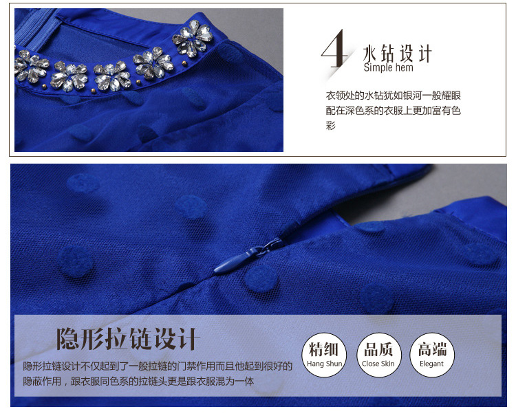 > 2015春季新款圆领透视网纱钉珠镶钻植绒修身连衣裙七分袖