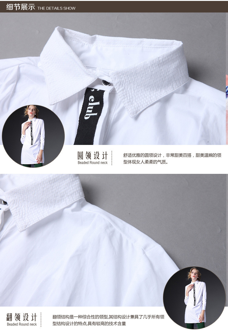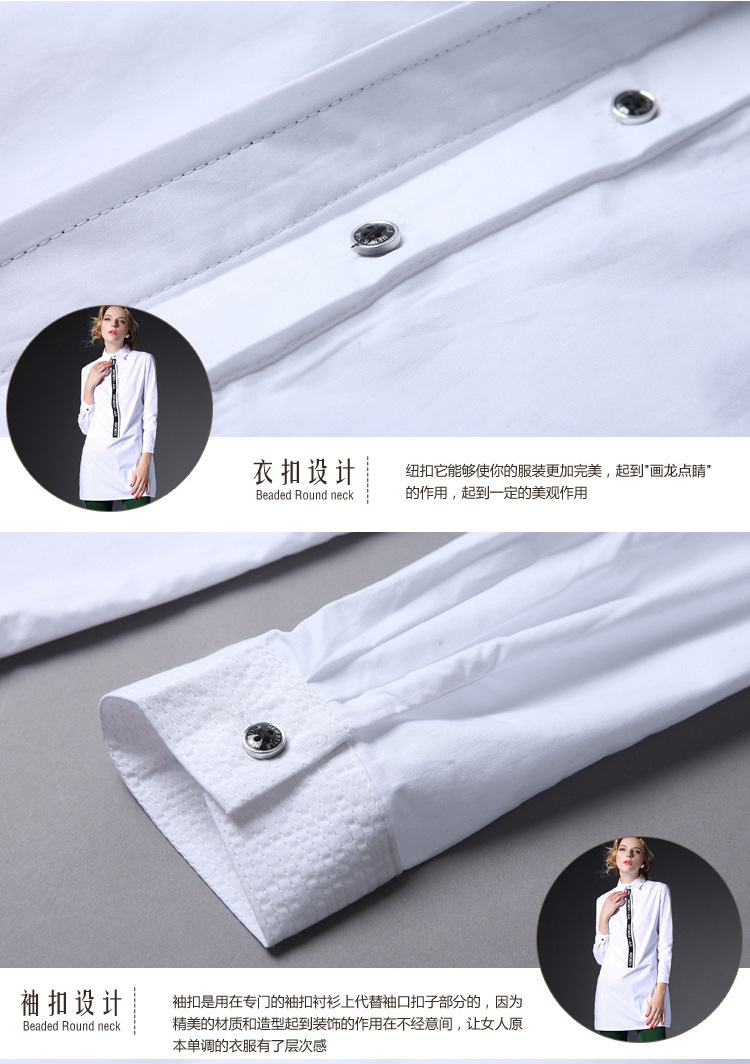 2015新款纯棉打底印花白衬衣女中长款宽松全棉长袖白色衬衫