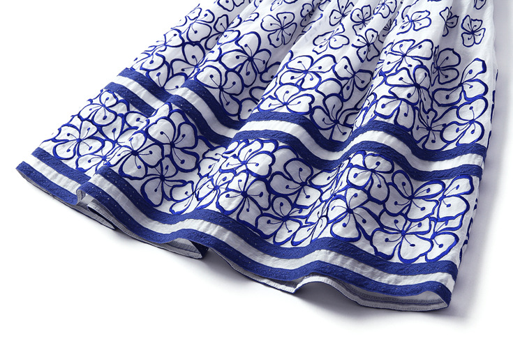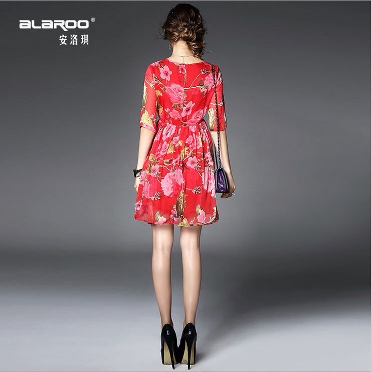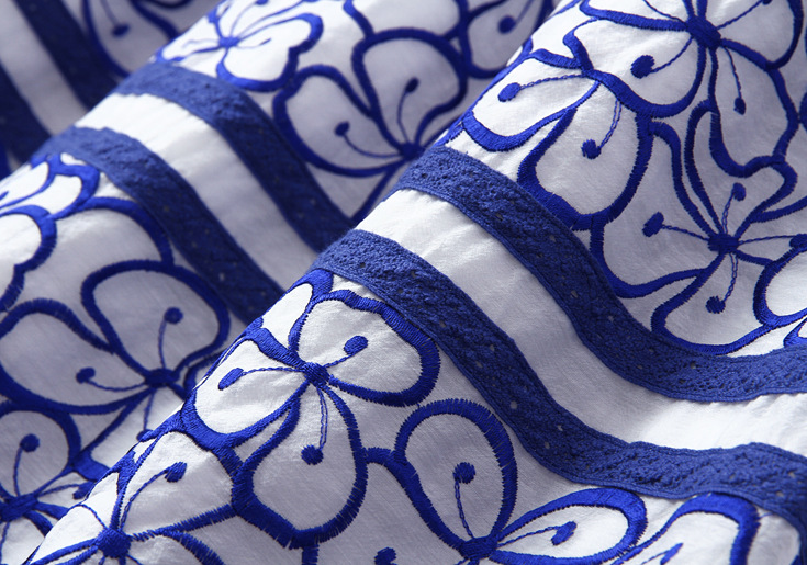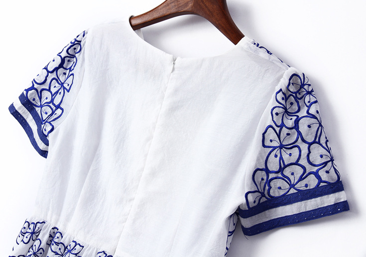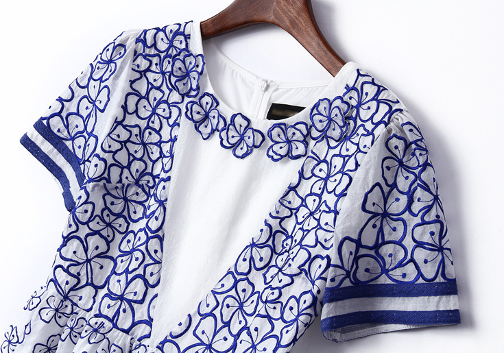 > 2015夏季欧美大牌圆领短袖重工绣花气质拼接收腰连衣裙