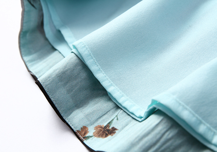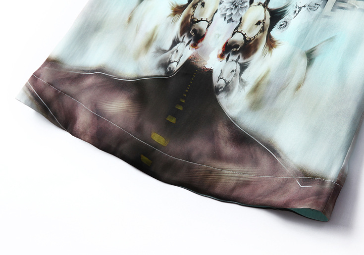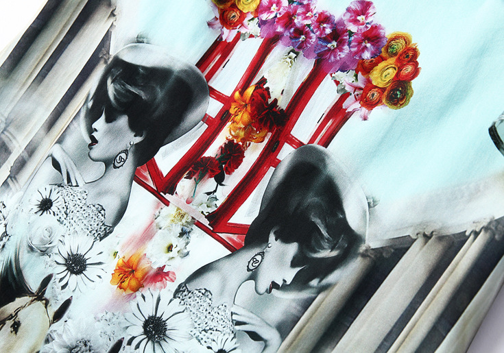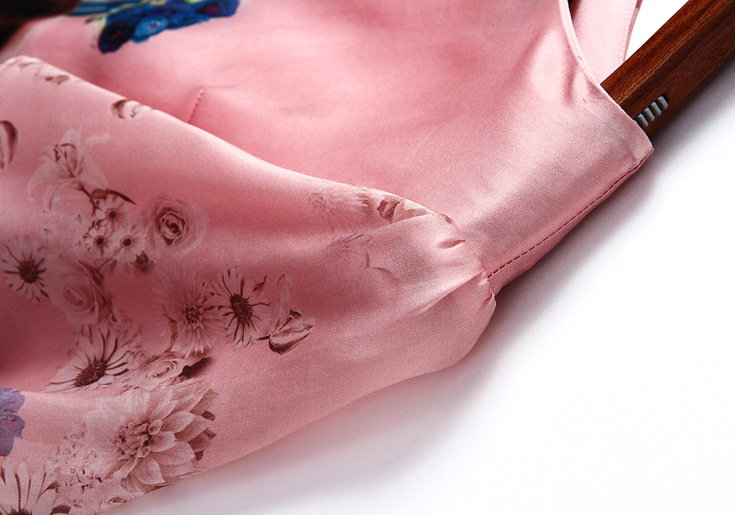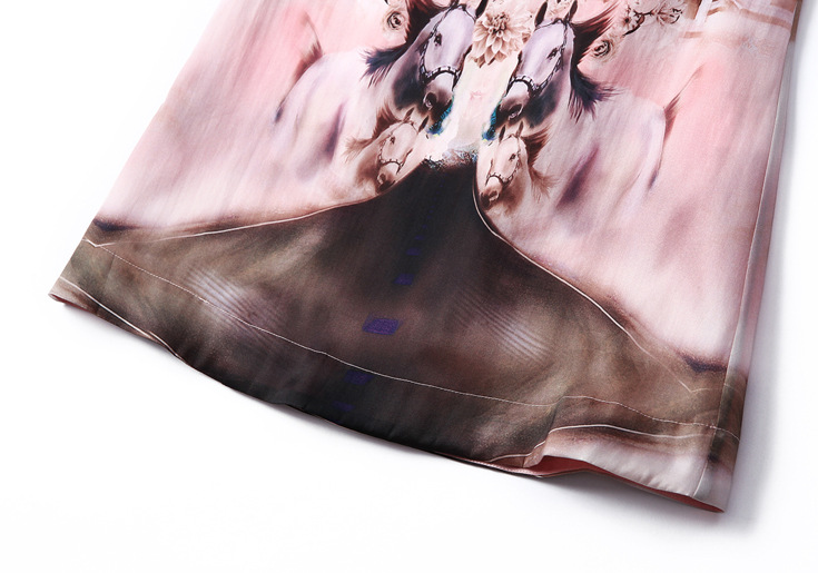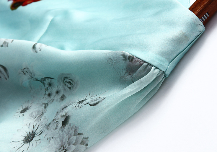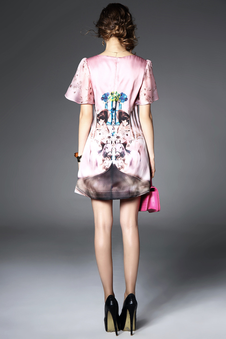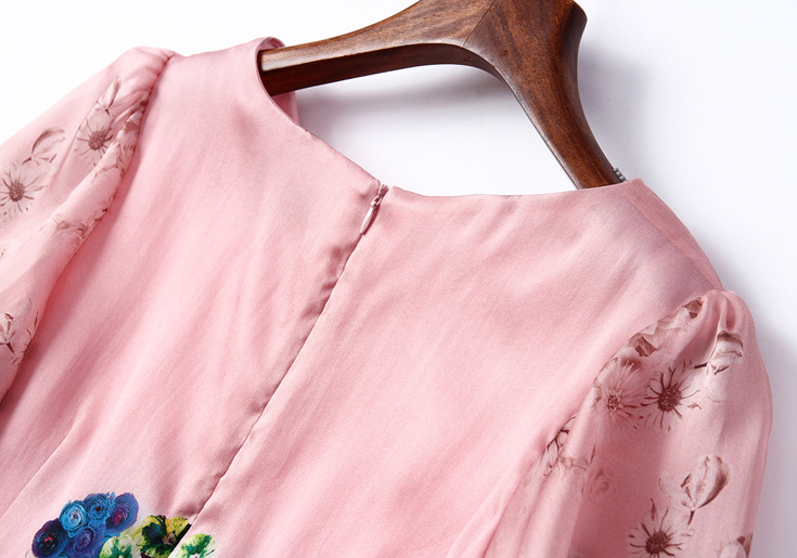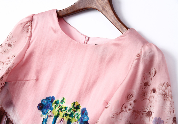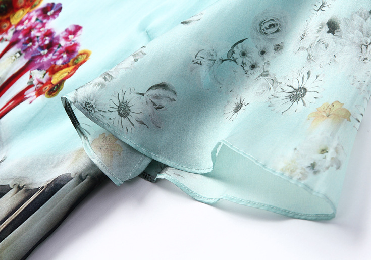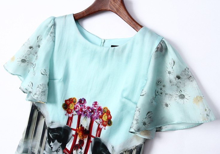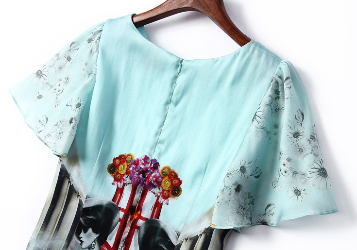 2015夏季新品 圆领喇叭袖真丝欧根纱印花连衣裙品质批发