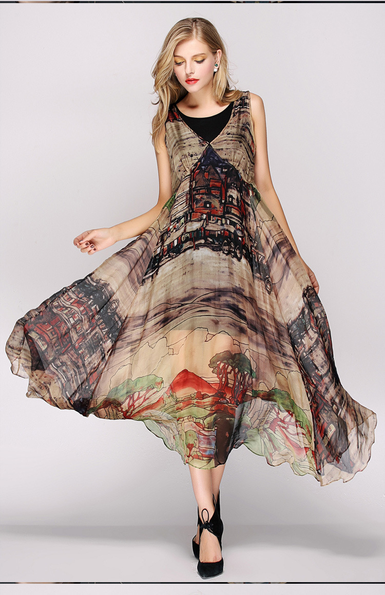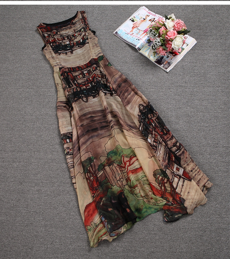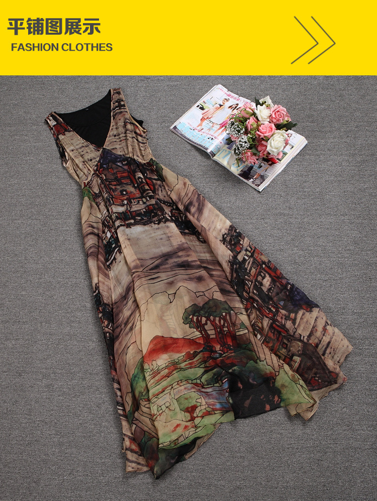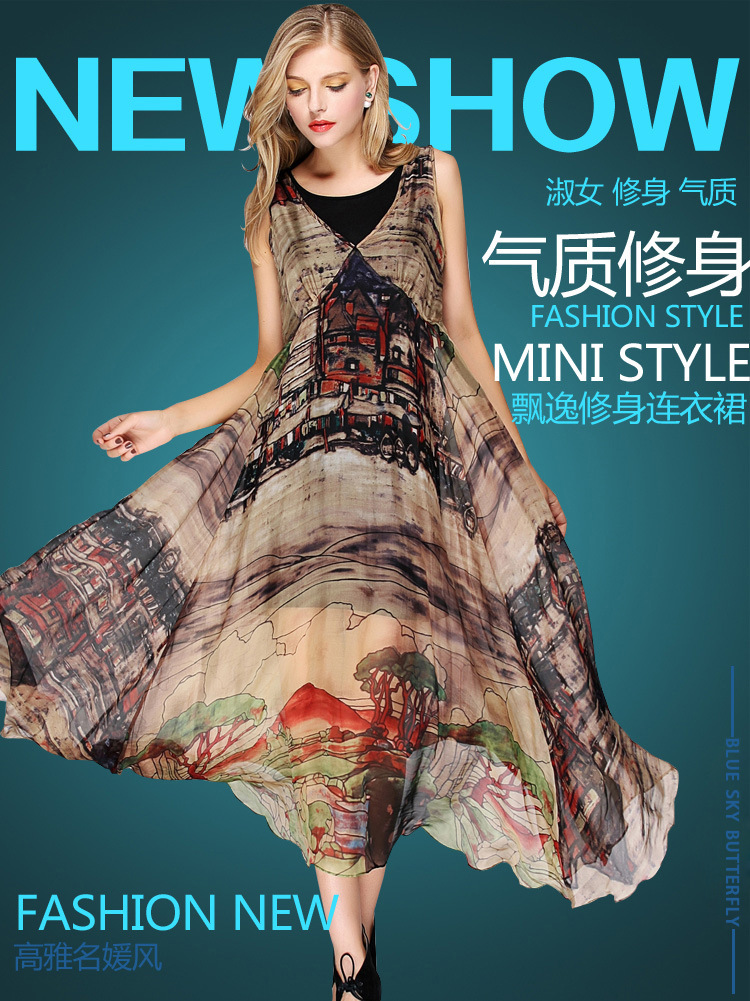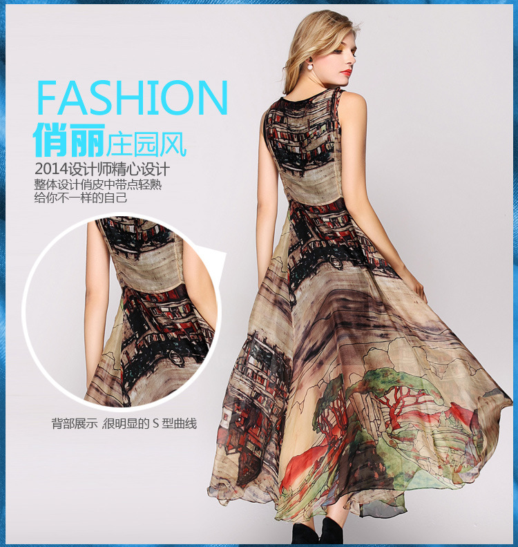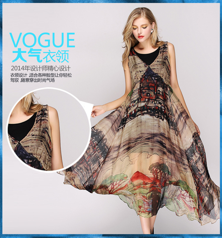 > 2015夏季女装高档真丝连衣裙长裙夏新款印花高腰百褶裙子