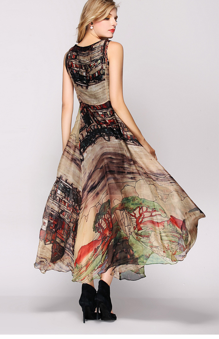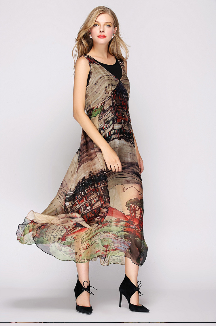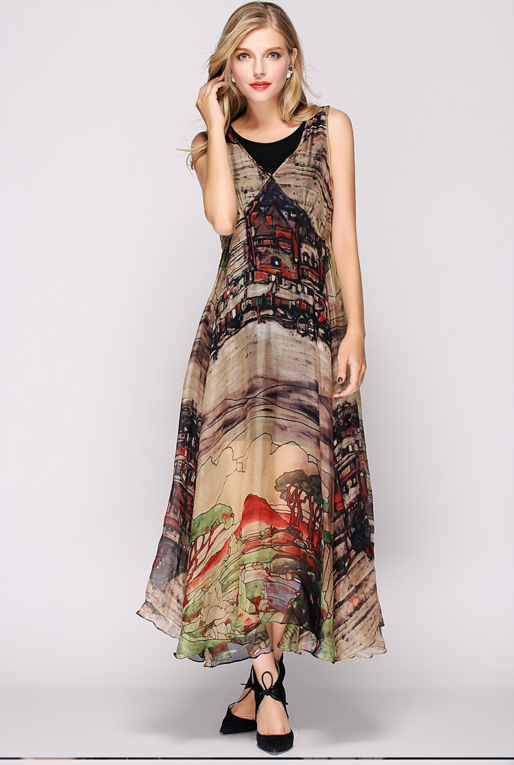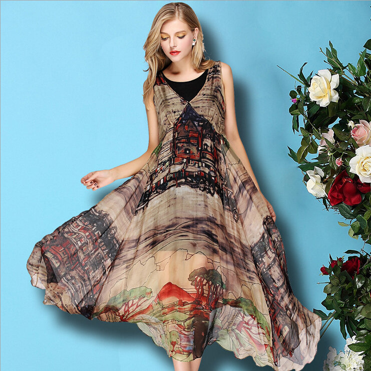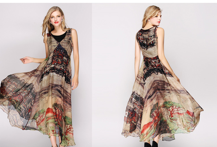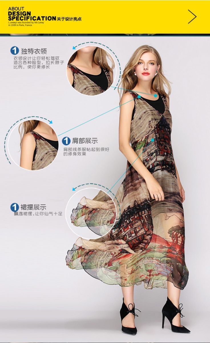 > 2015夏季女装高档真丝连衣裙长裙夏新款印花高腰百褶裙子