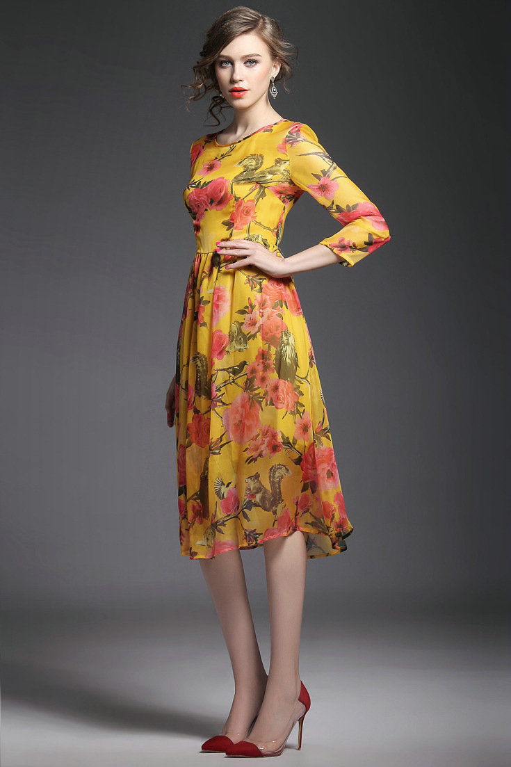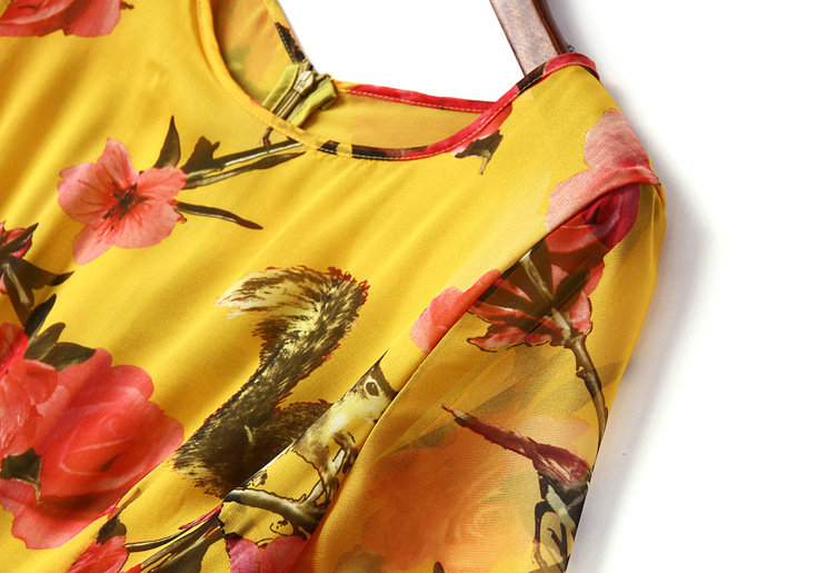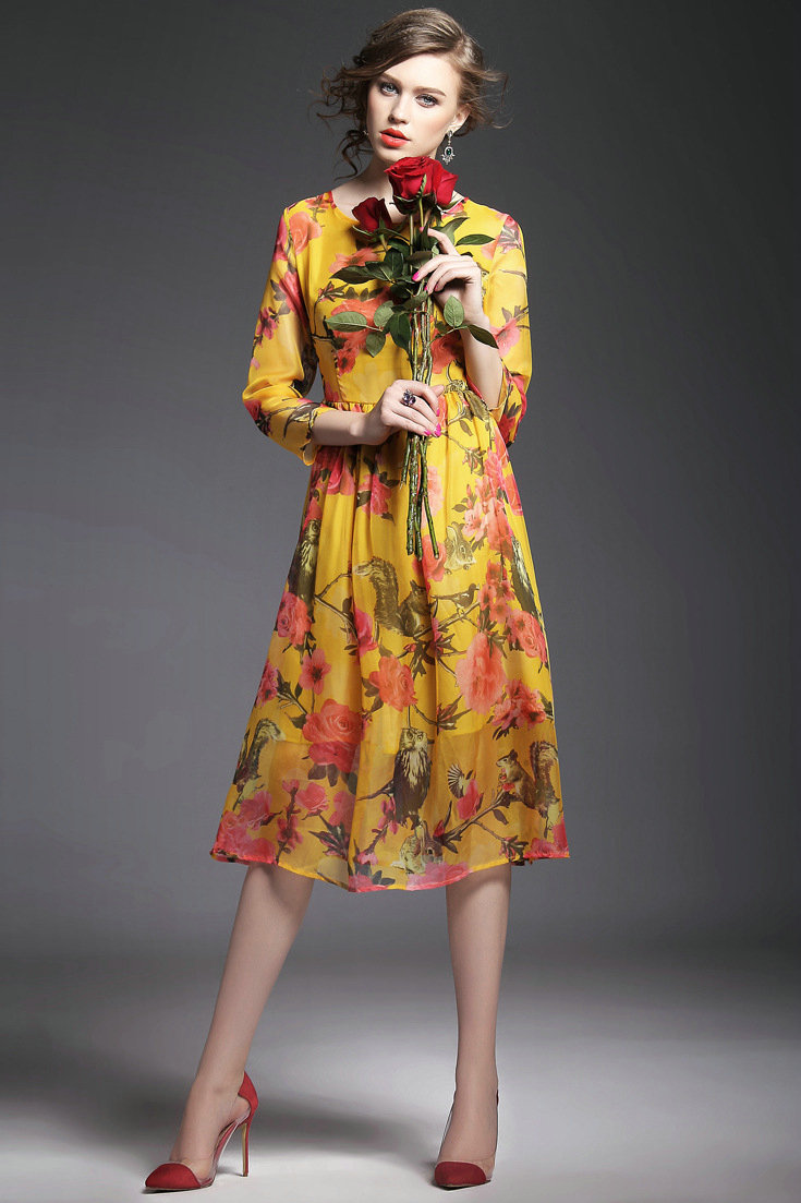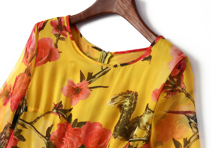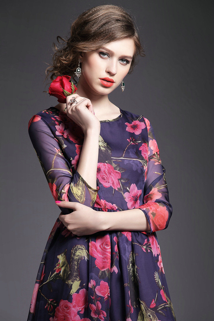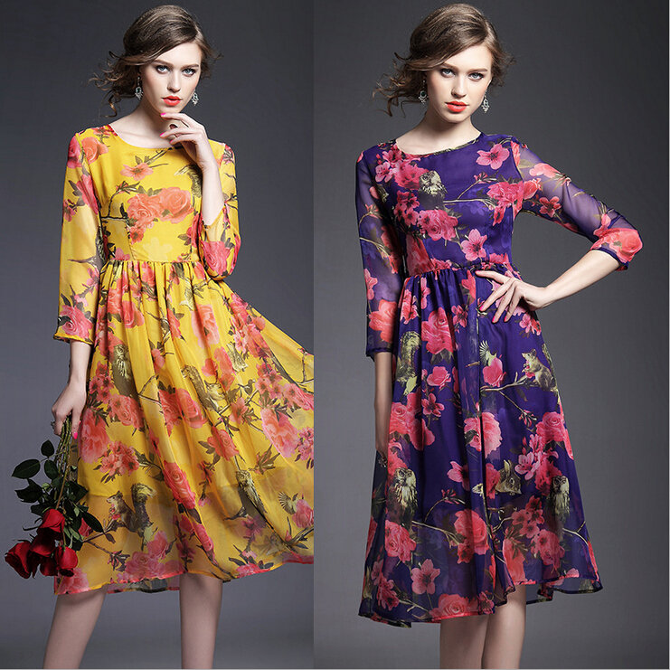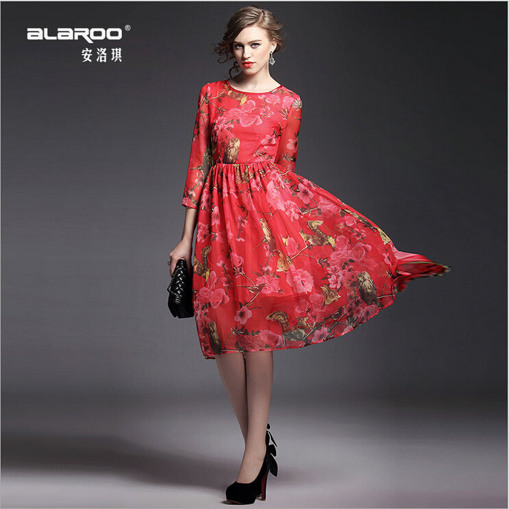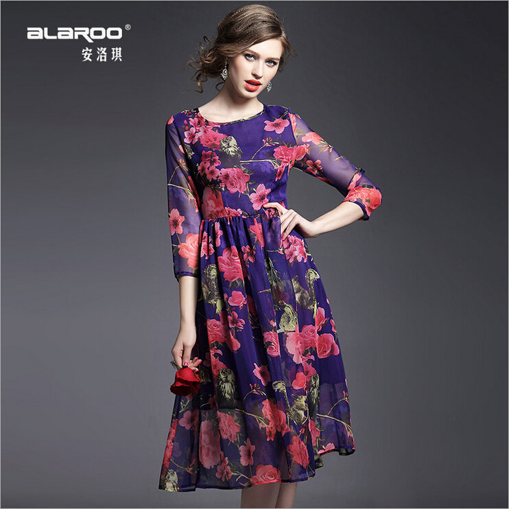 2015春夏新款欧美风印花高档桑蚕丝七分袖A字裙真丝连衣裙