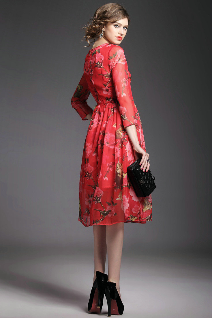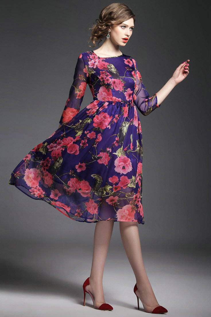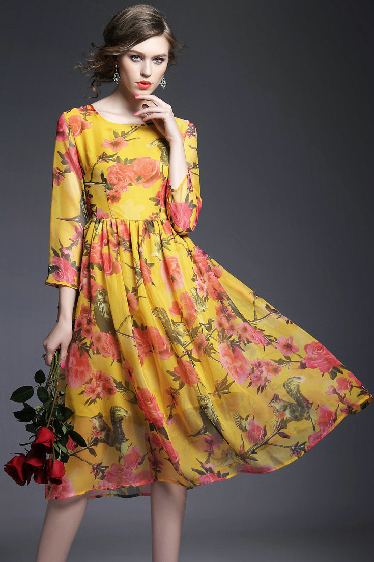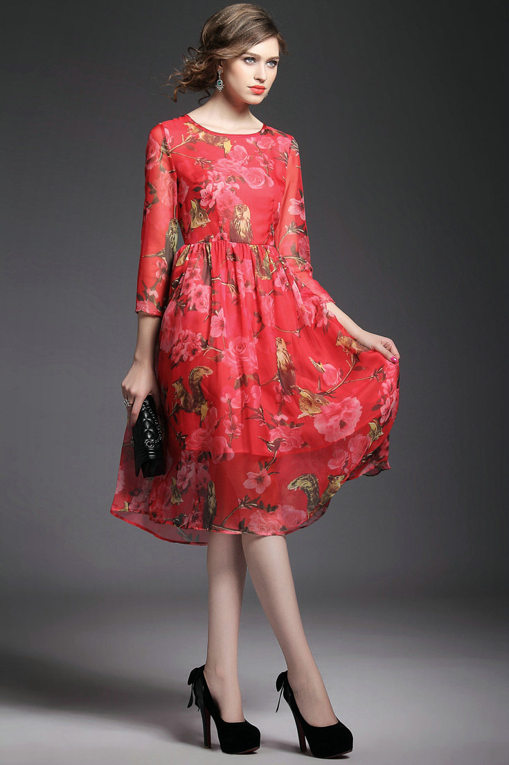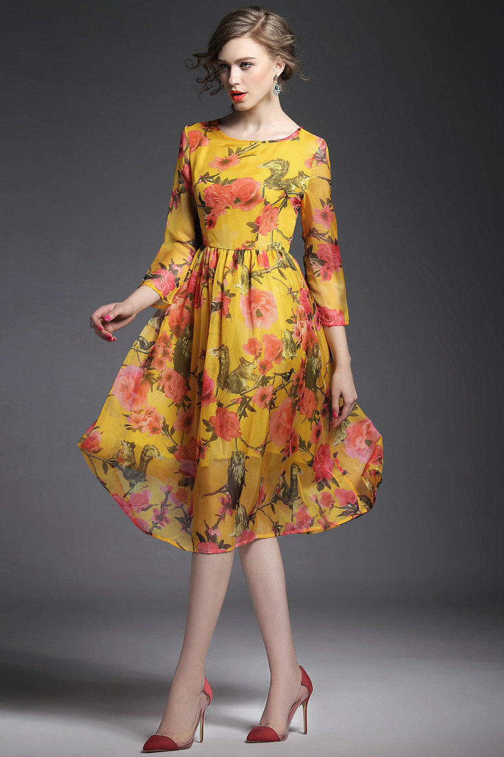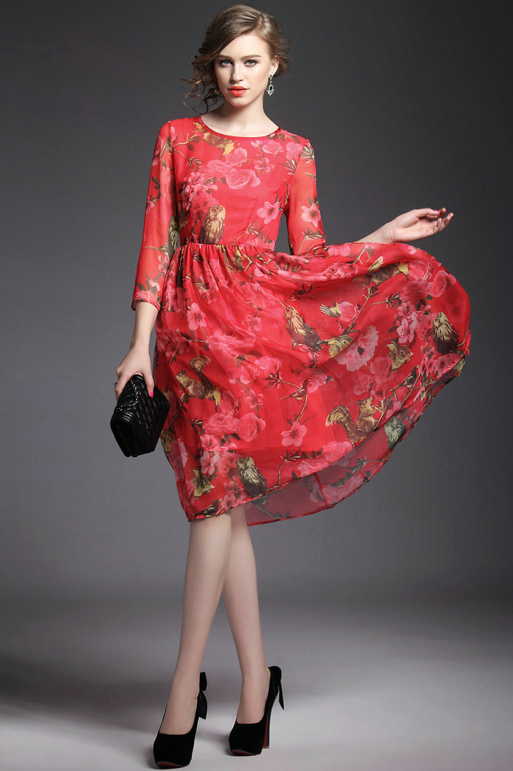 2015春夏新款欧美风印花高档桑蚕丝七分袖A字裙真丝连衣裙