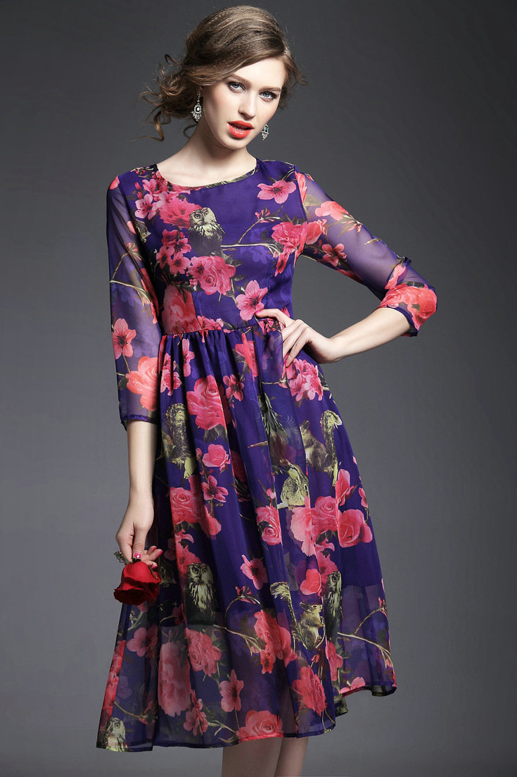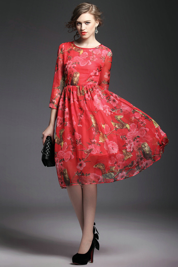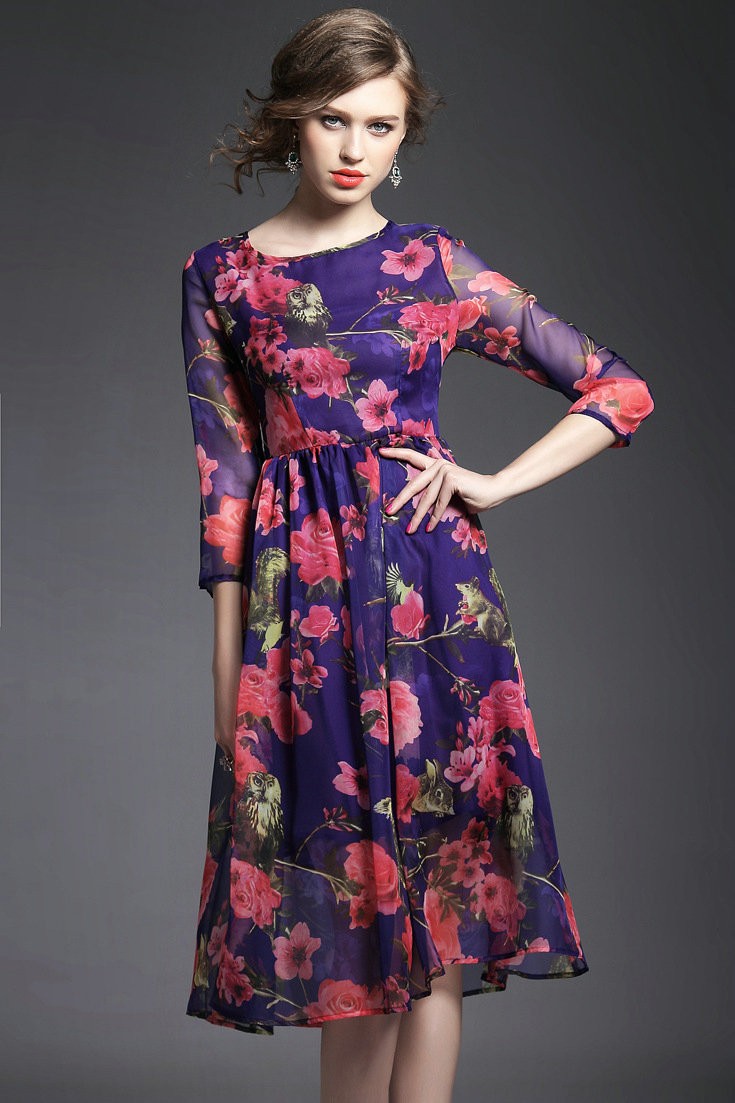 > 2015春夏新款 欧美大牌圆领猫头鹰印花修身大摆中长连衣裙