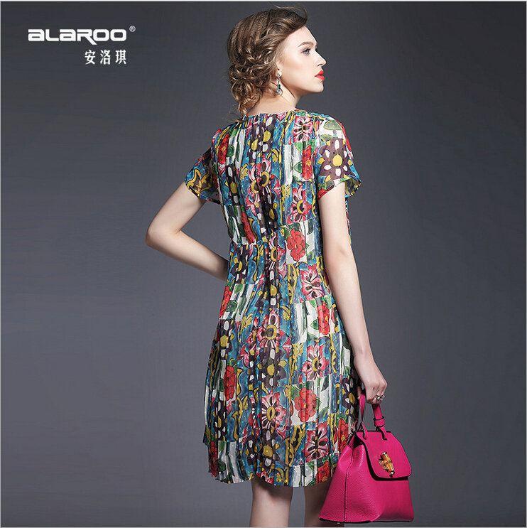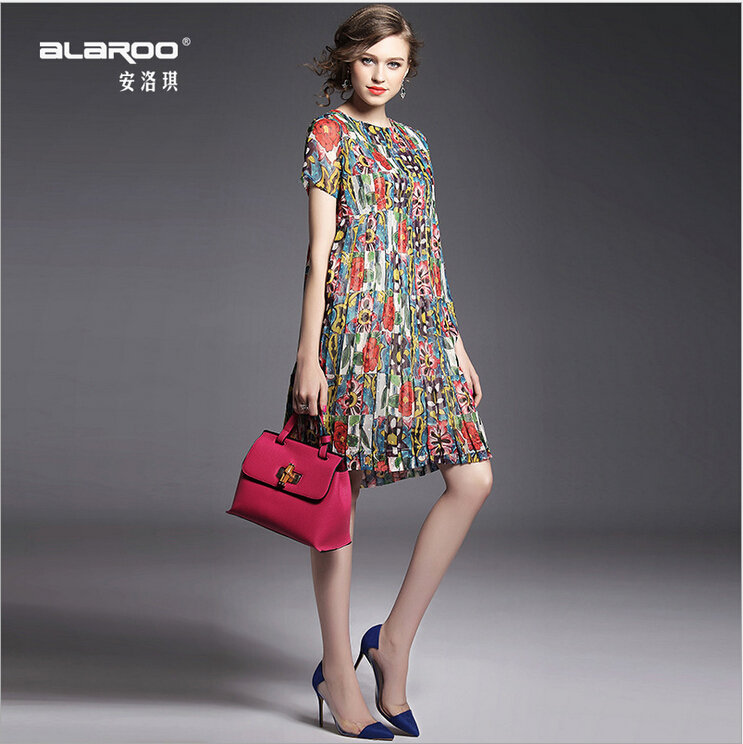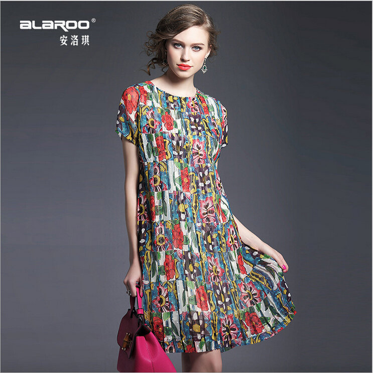 > 2015夏季新款 时尚圆领印花破洞压褶气质大摆中长连衣裙