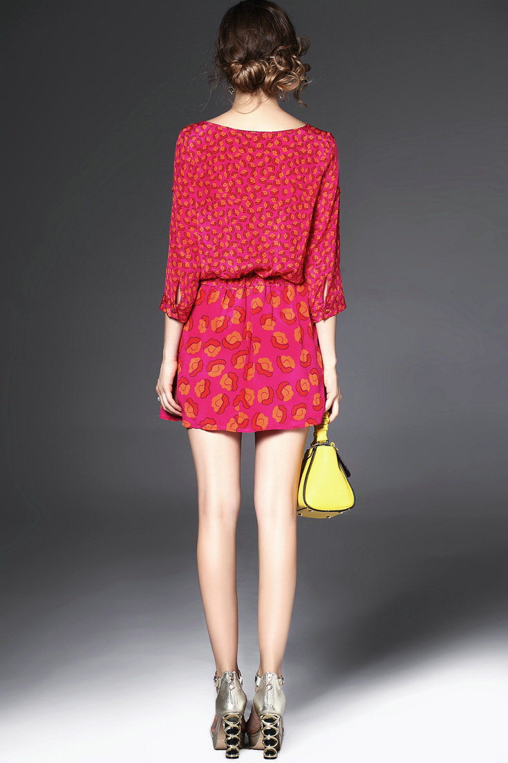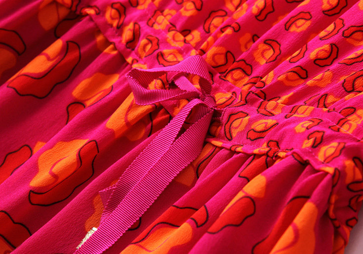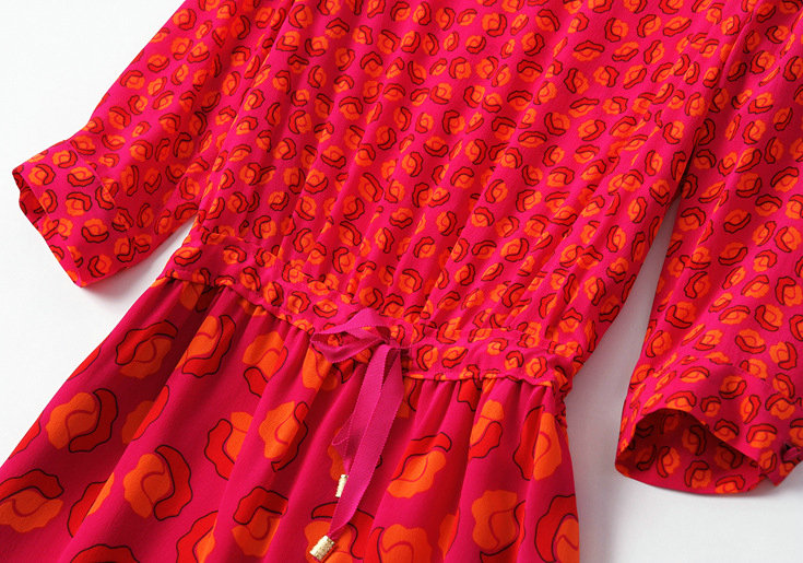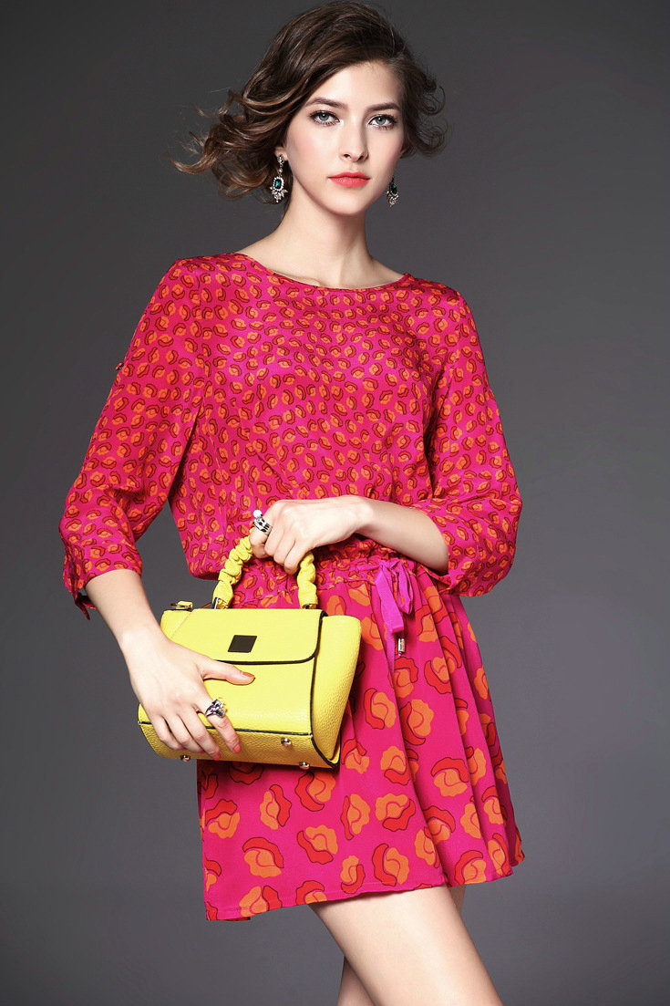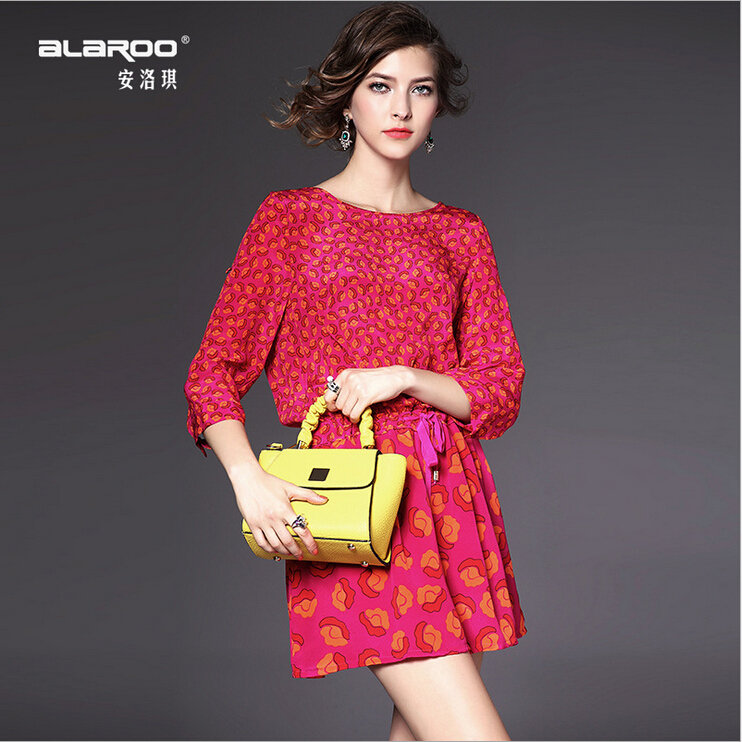 > 2015欧洲女装春夏新款 圆领七分袖真丝印花收腰系带修身连衣裙