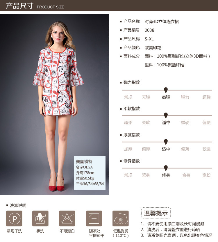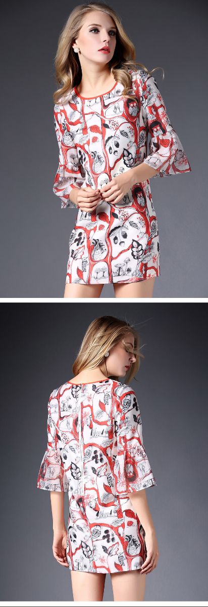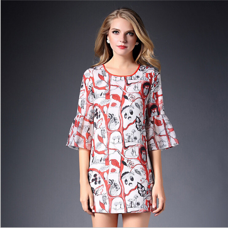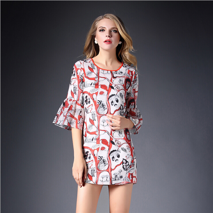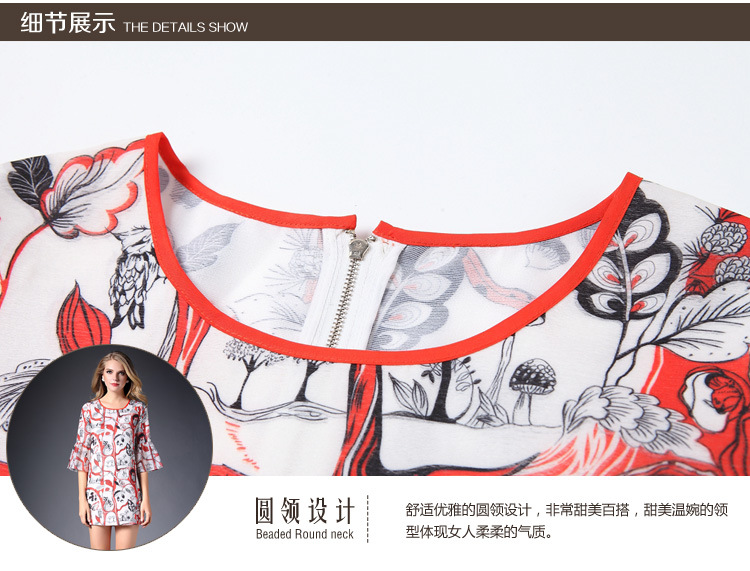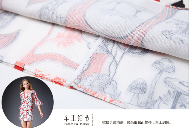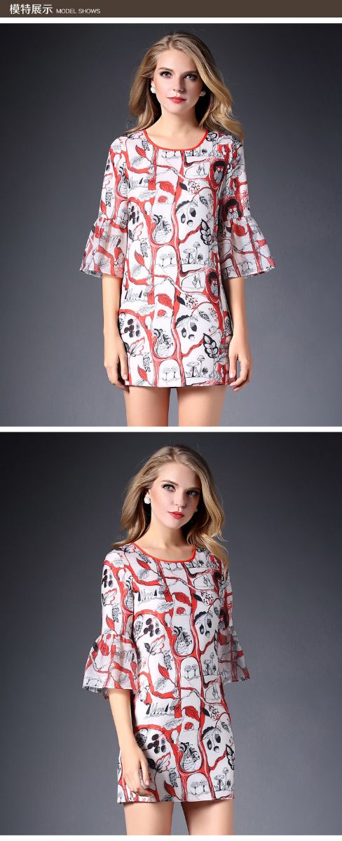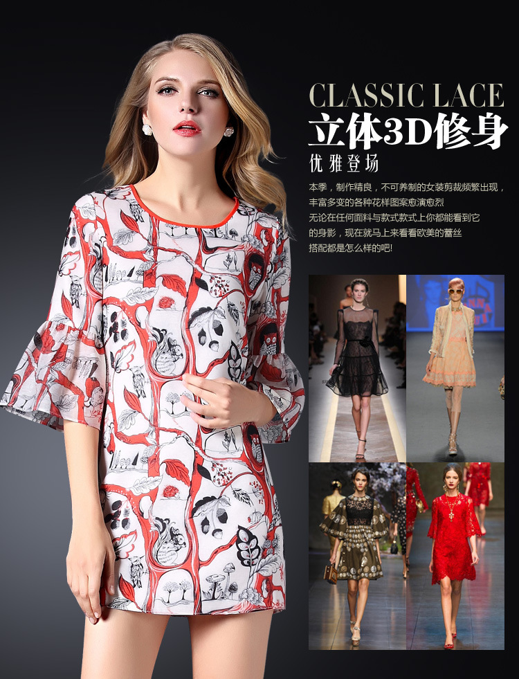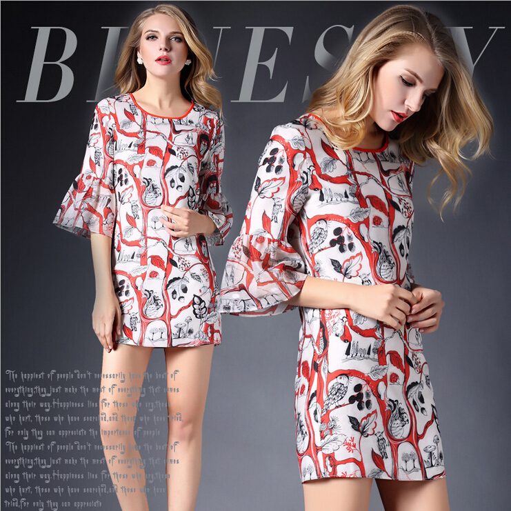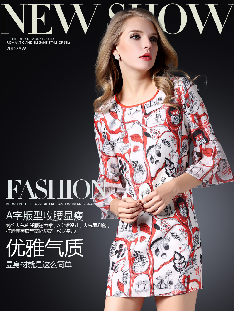 > 2015春装新款欧美女装喇叭袖连衣裙女中袖气质修身印花A字裙