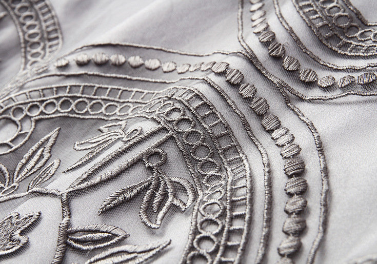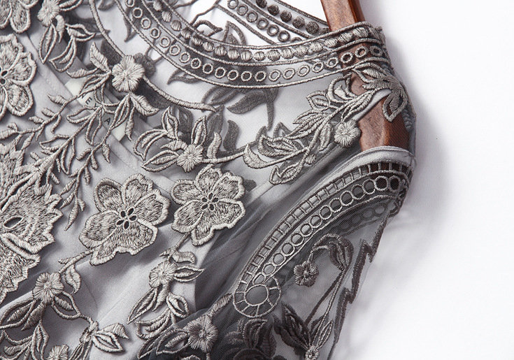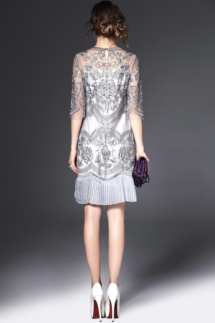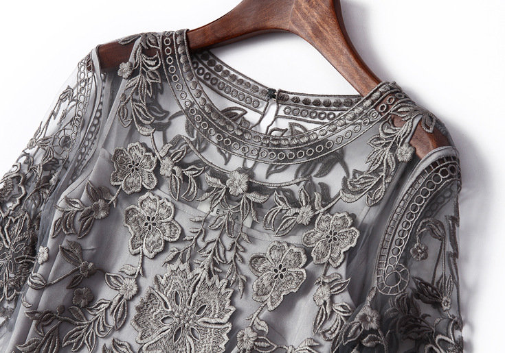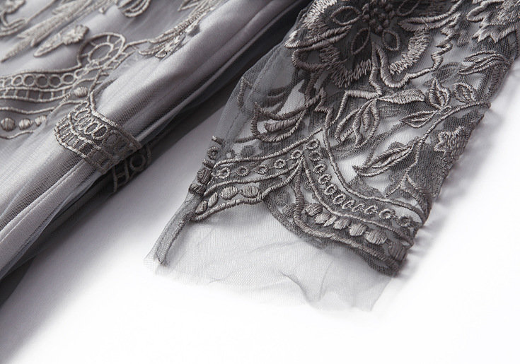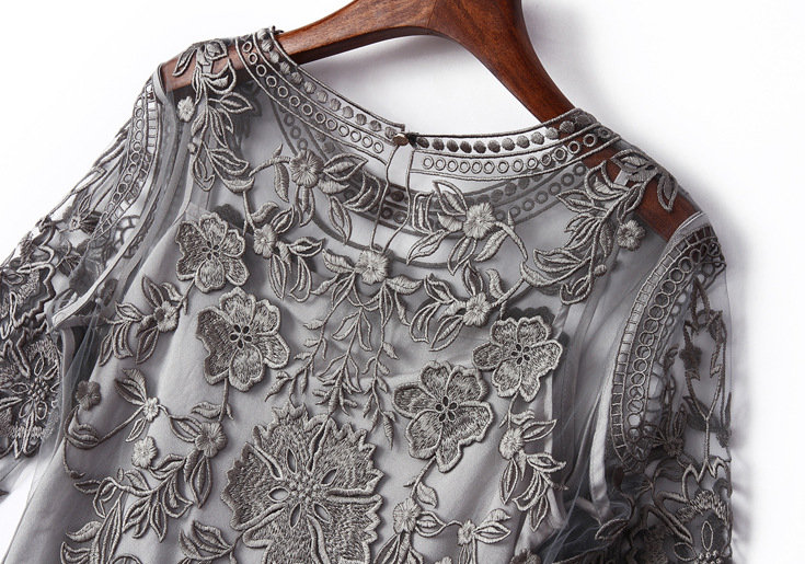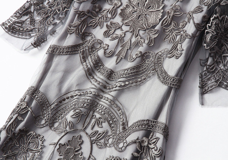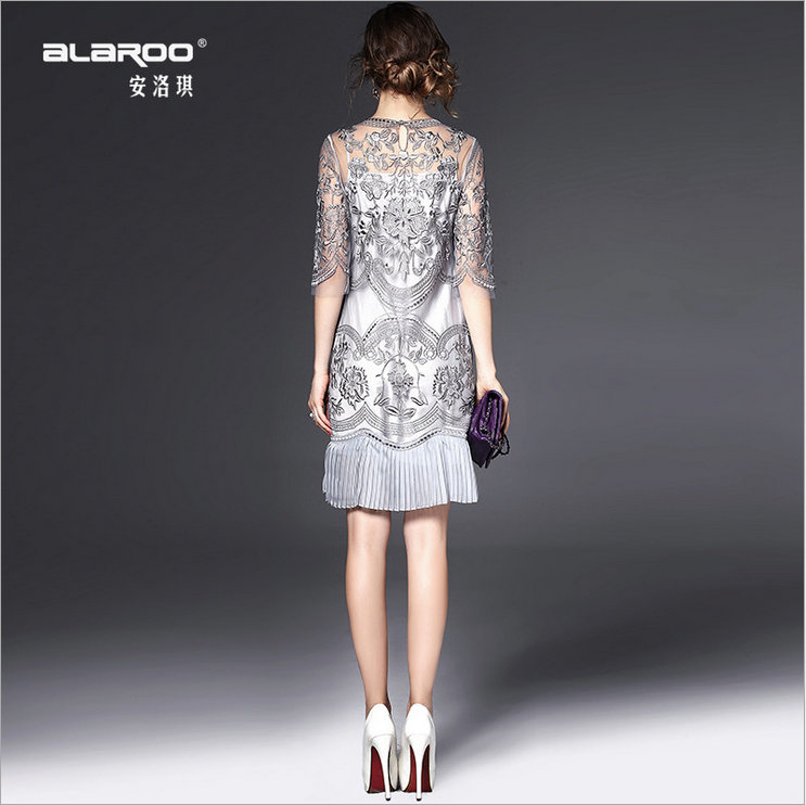 2015欧美风春季仙女裙气质新款刺绣网纱连衣裙七分袖大摆裙