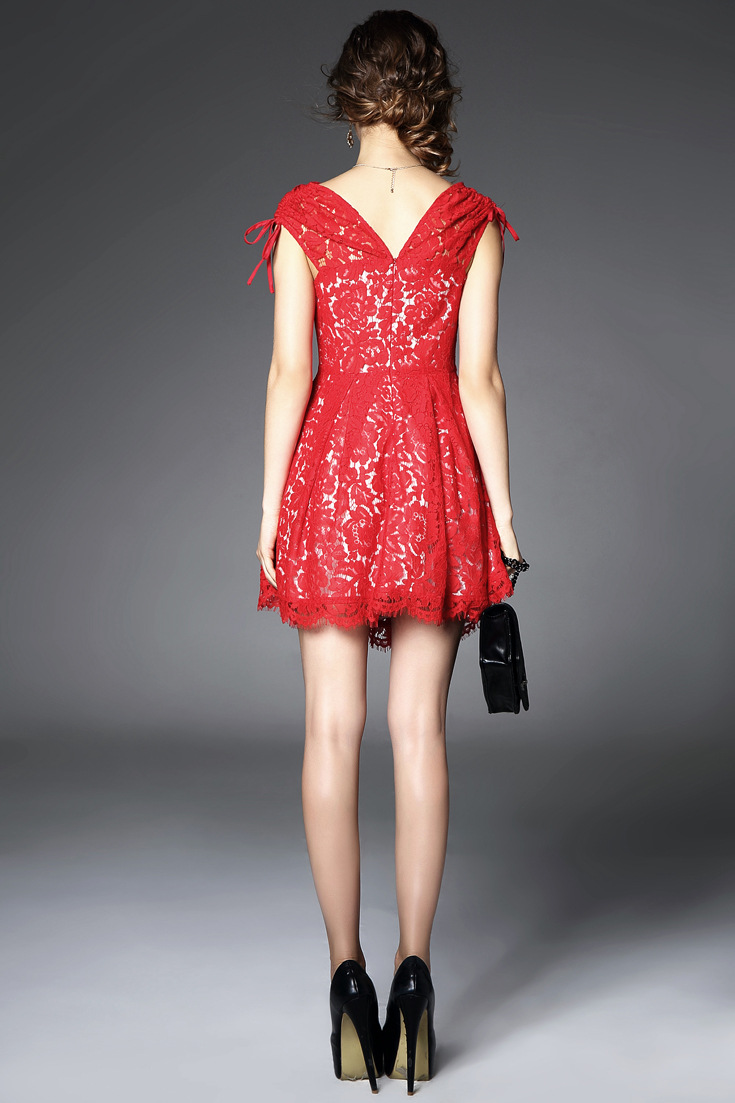 > 2015夏季新款女装 圆领包肩袖纯色蕾丝性感露背波浪边修身短裙