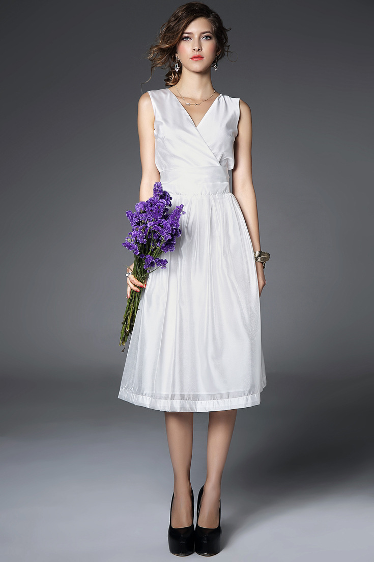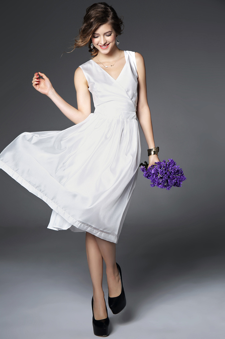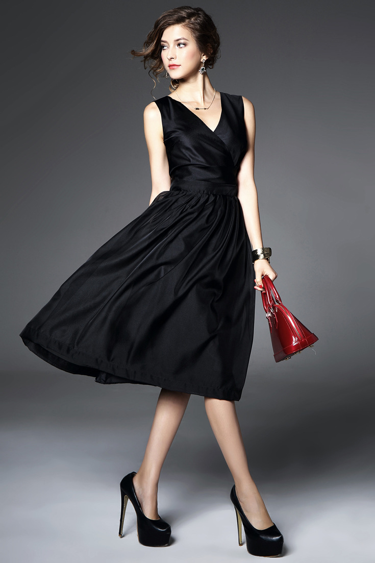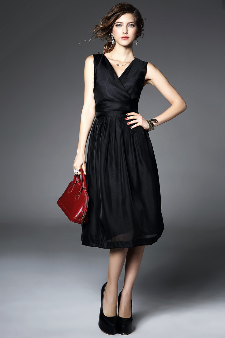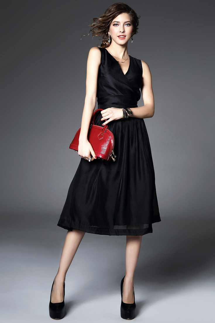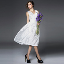 > 2015夏季女装 欧美v领时尚气质假两件纯色修身长裙品质连衣裙