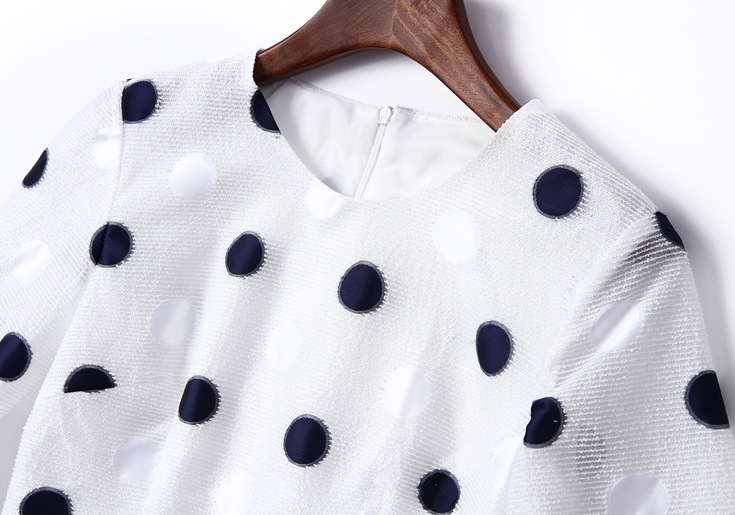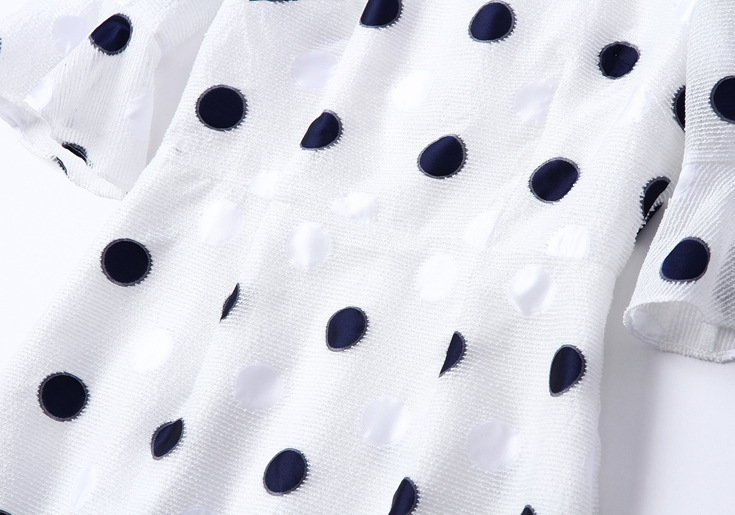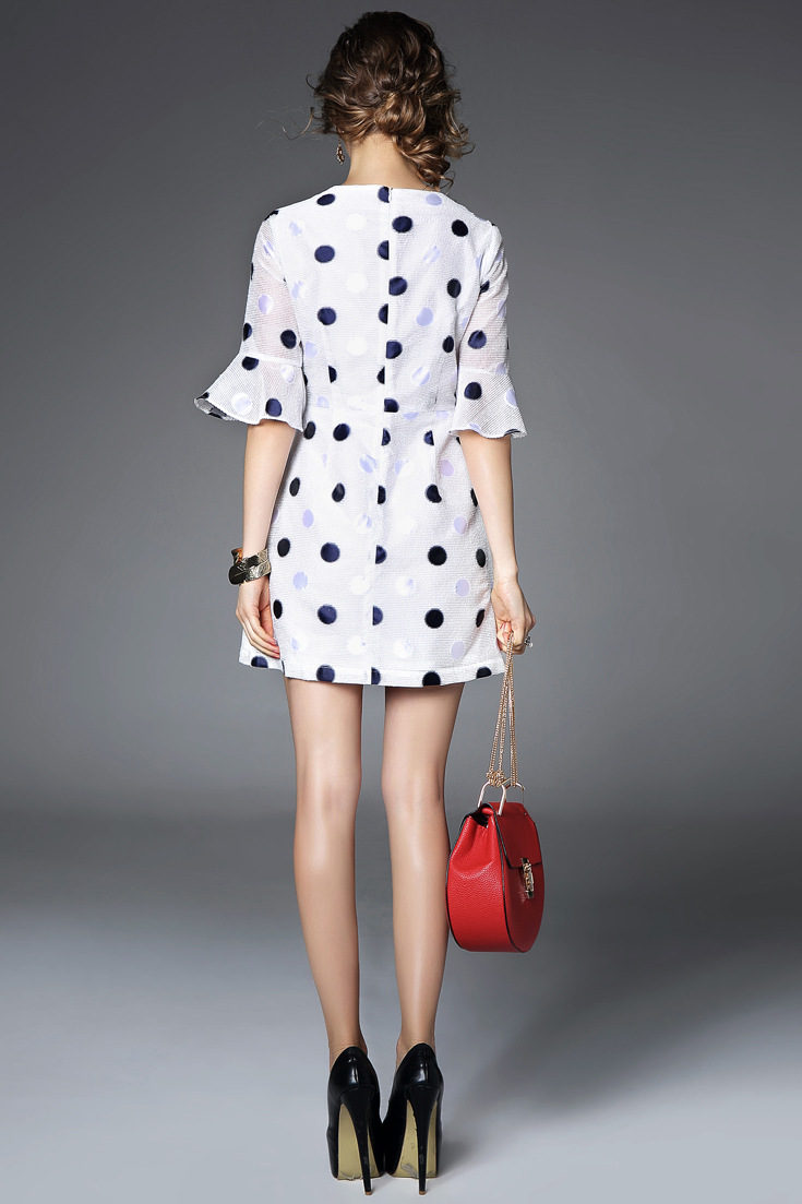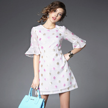 > 2015夏季女装 圆领喇叭袖甜美波点修身短裙品牌连衣裙