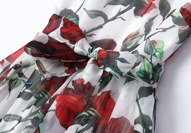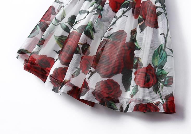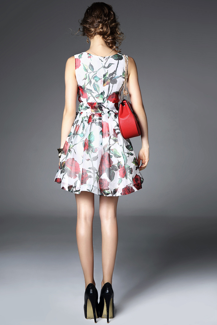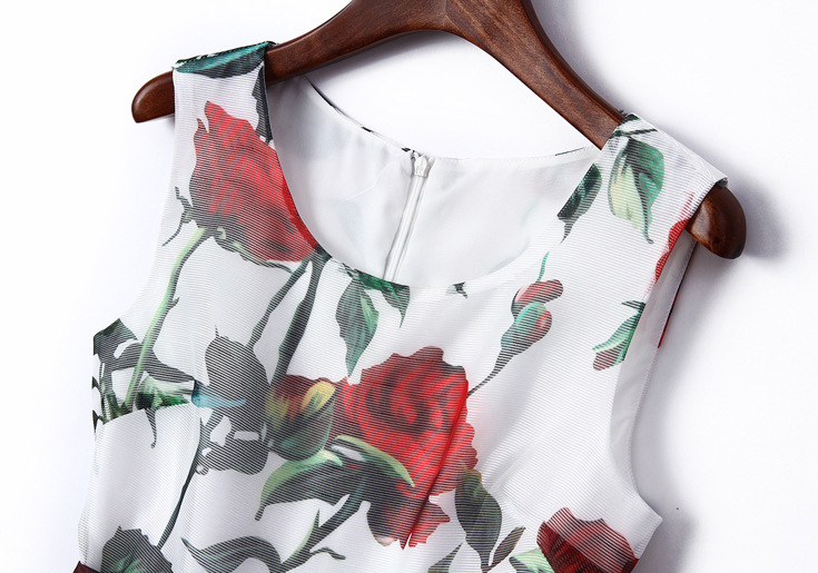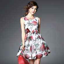 > 2015夏季女装品质新款 圆领无袖玫瑰印花系带收腰修身a字裙