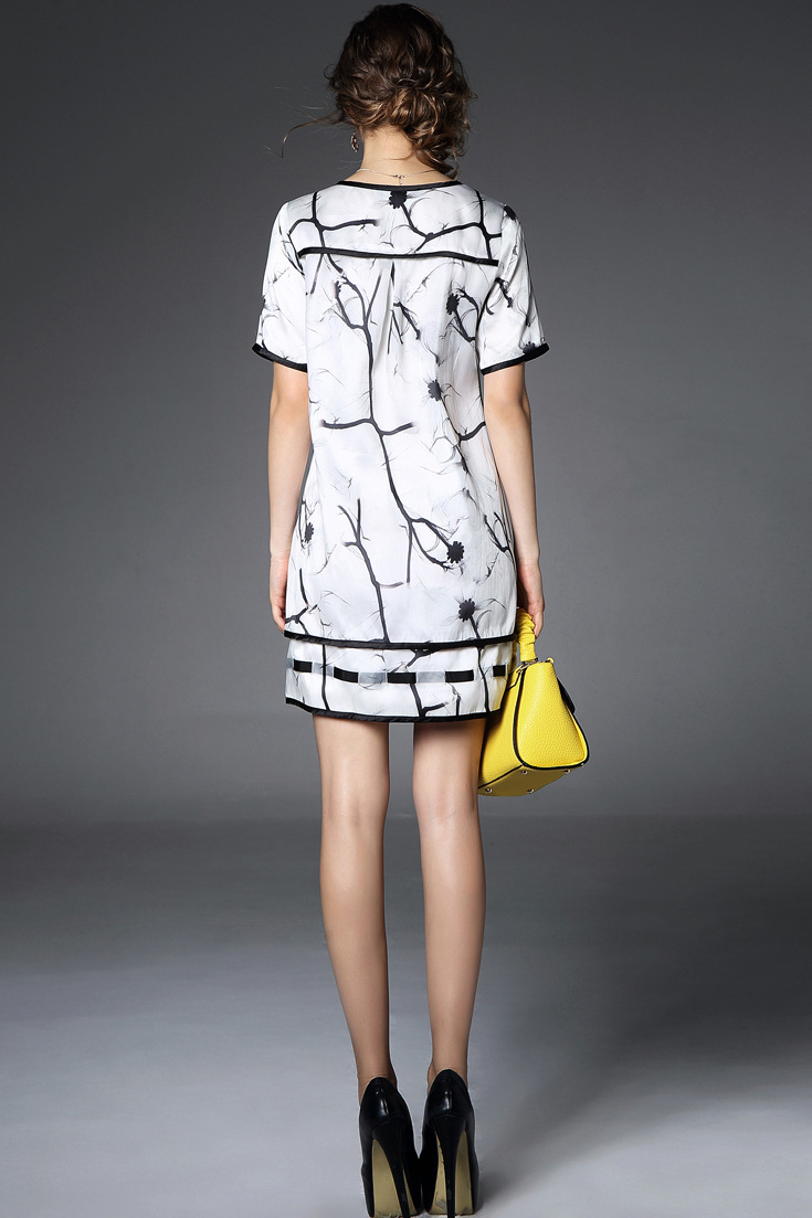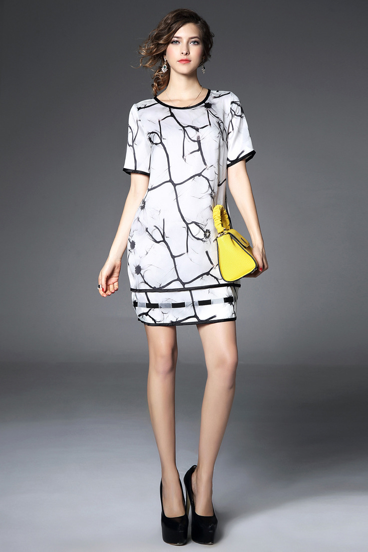 > 2015夏装新款 欧美大牌圆领手工钉珠水墨印花织带拼接真丝连衣裙