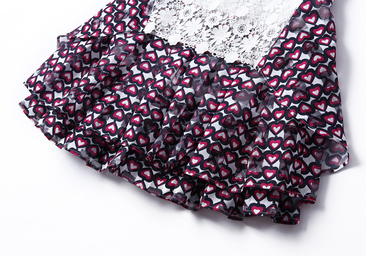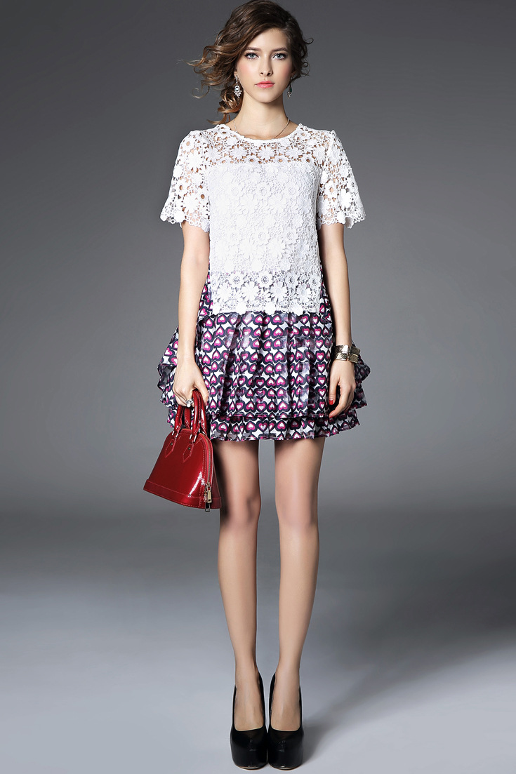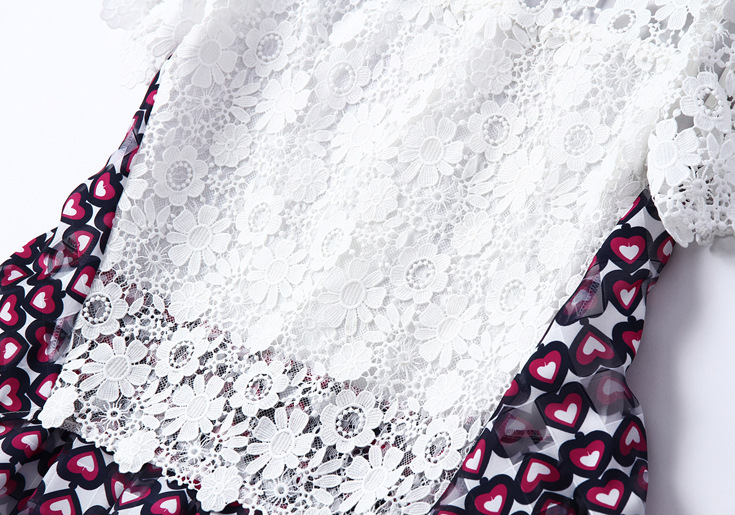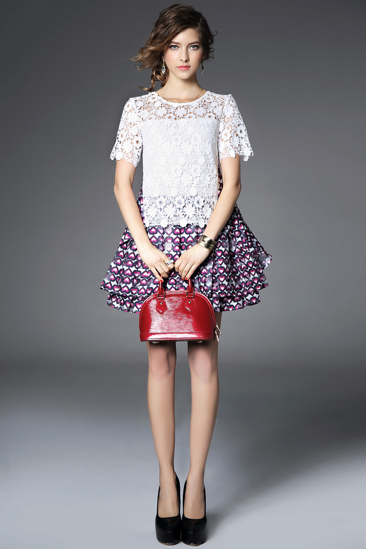 > 2015夏装新款 欧美时尚圆领短袖心形印花水溶绣花拼接层层a字短裙