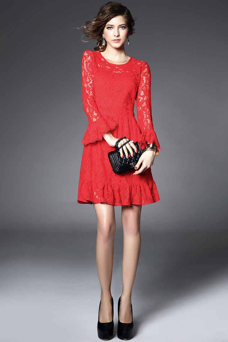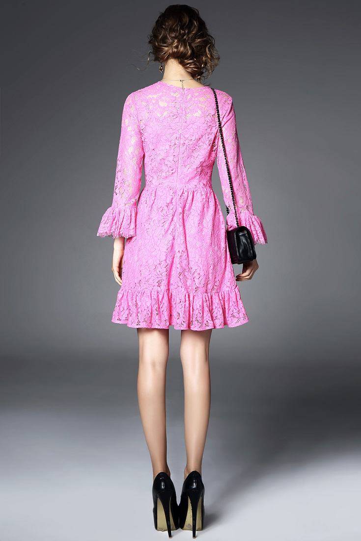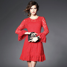 > 2015春夏女装新款 圆领喇叭袖鱼尾纯色气质修身一步裙蕾丝连衣裙
