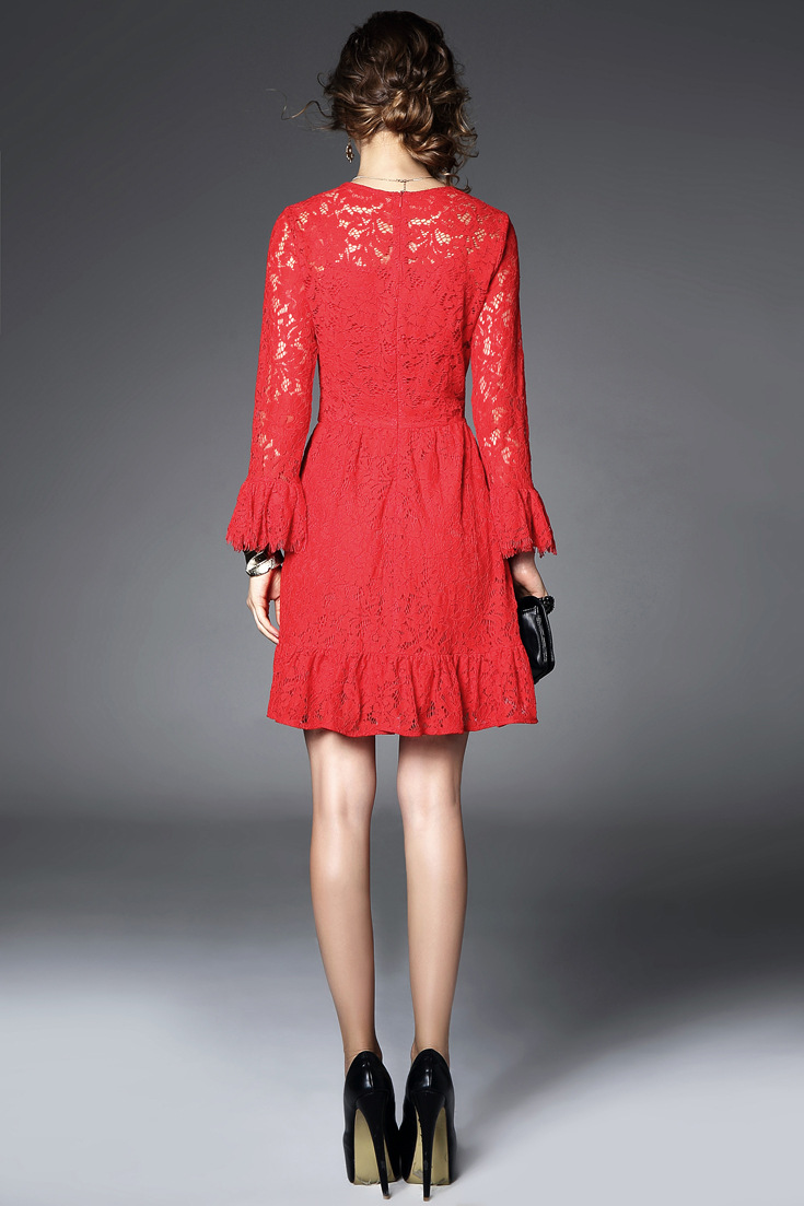 2015春夏女装新款 圆领喇叭袖鱼尾纯色气质修身一步裙蕾丝连衣裙
