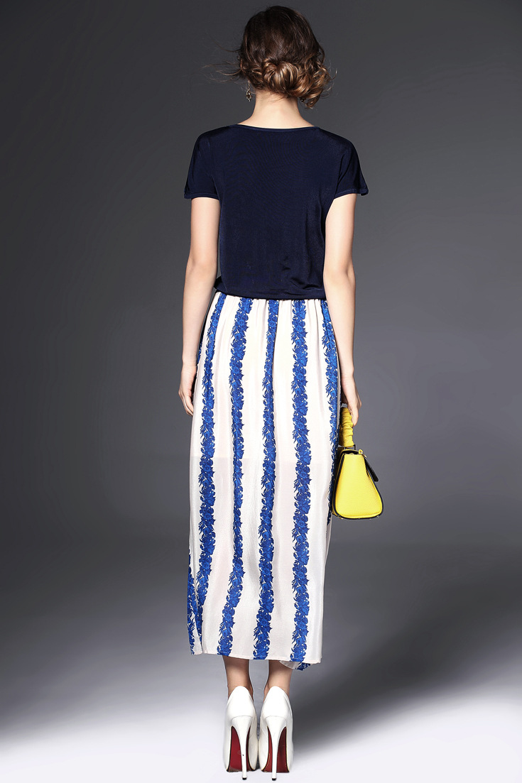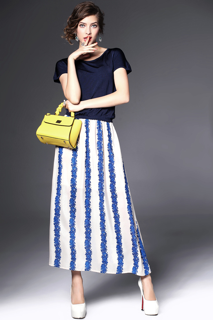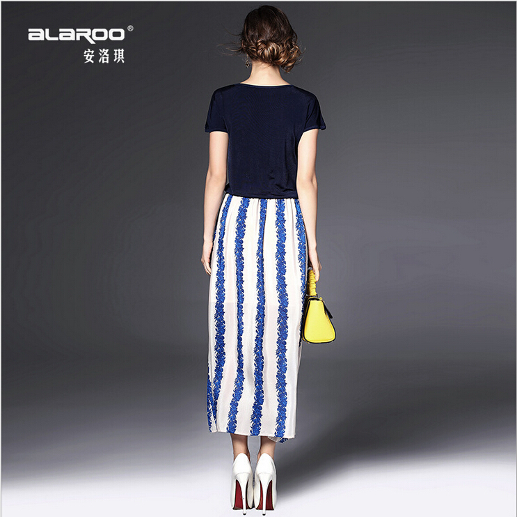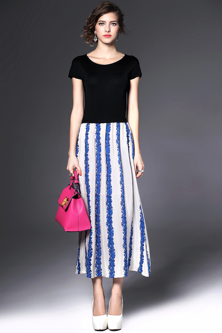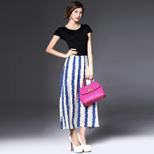 2015夏季女装 欧美大牌圆领弹力针织拼接气质条纹真丝长裙
