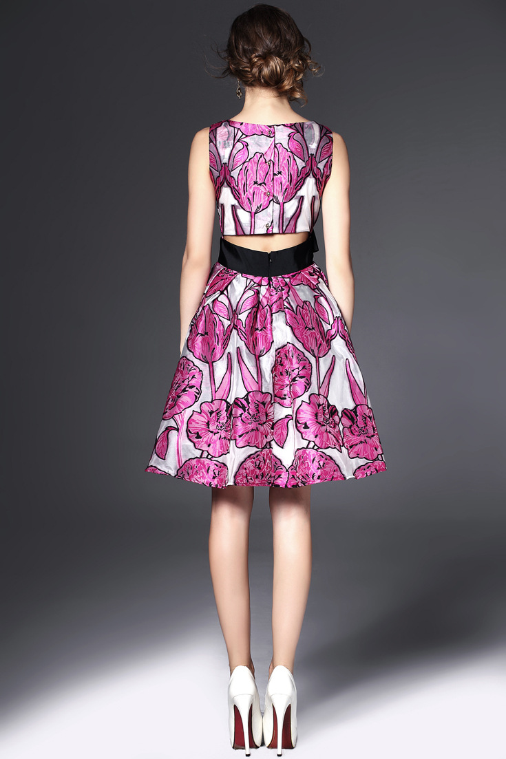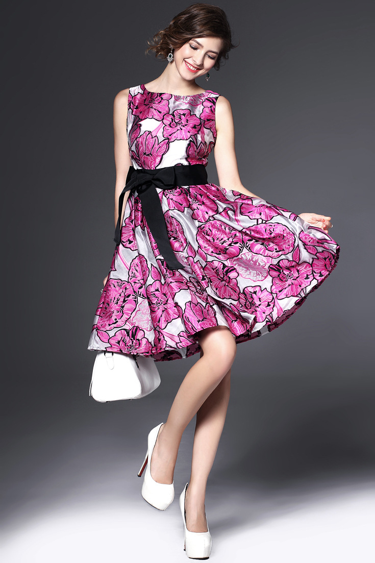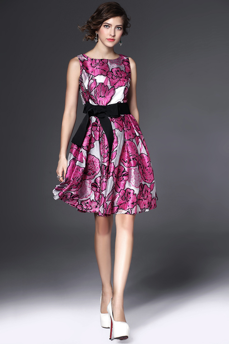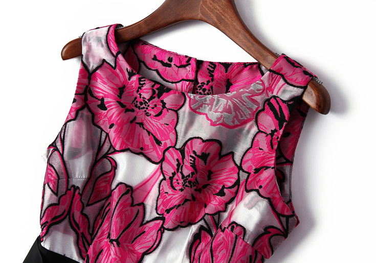 > 2015夏季女装新款 花朵绣花系带蝴蝶结拼接修身a字裙无袖连衣裙