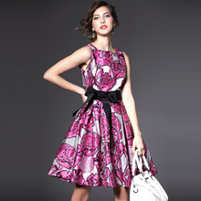 2015夏季女装新款 花朵绣花系带蝴蝶结拼接修身a字裙无袖连衣裙