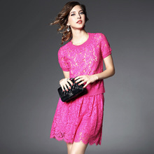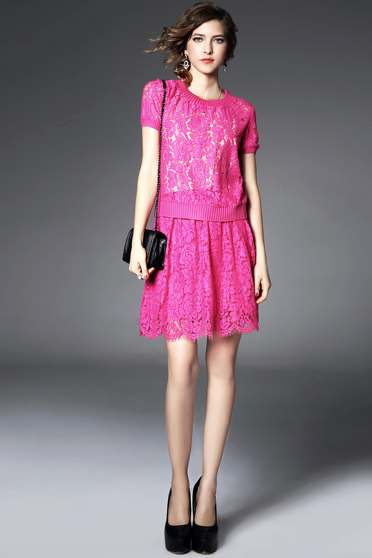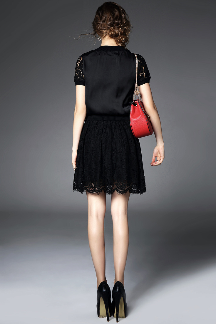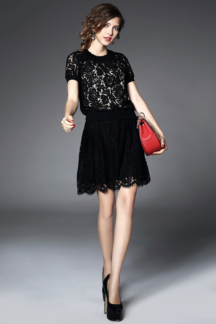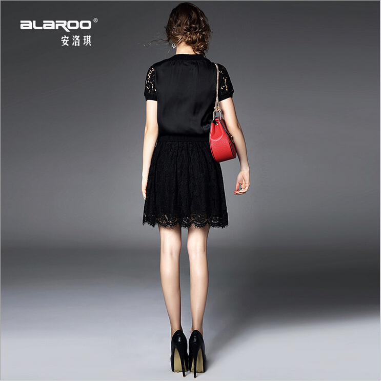 > 2015夏季新款 圆领弹力螺纹蕾丝拼接上衣+纯色半裙套装
