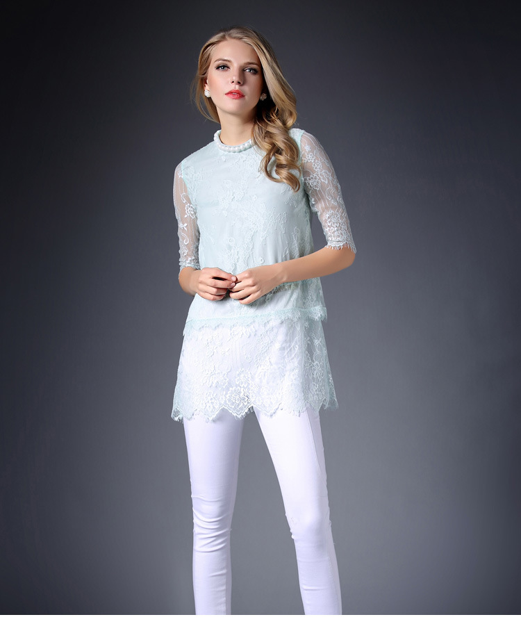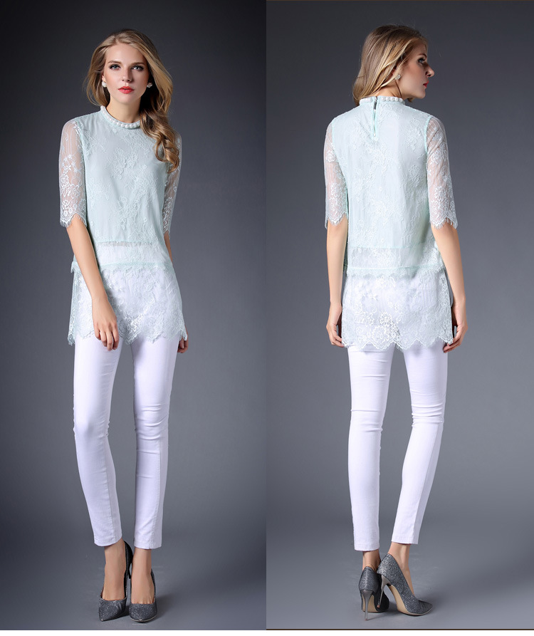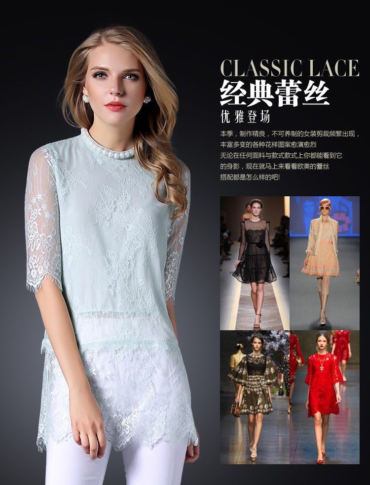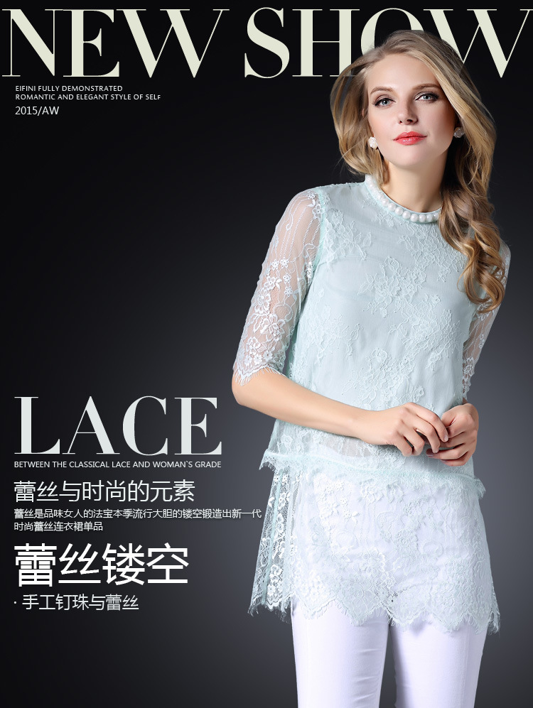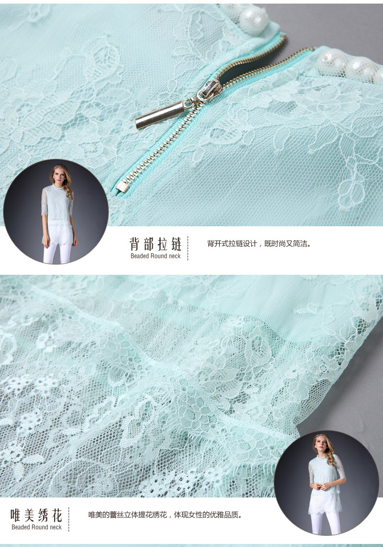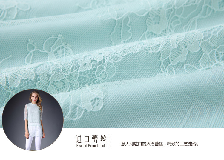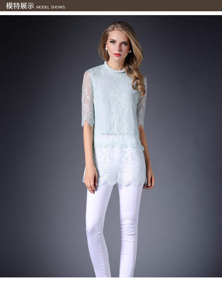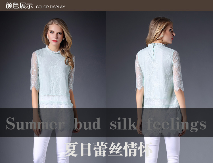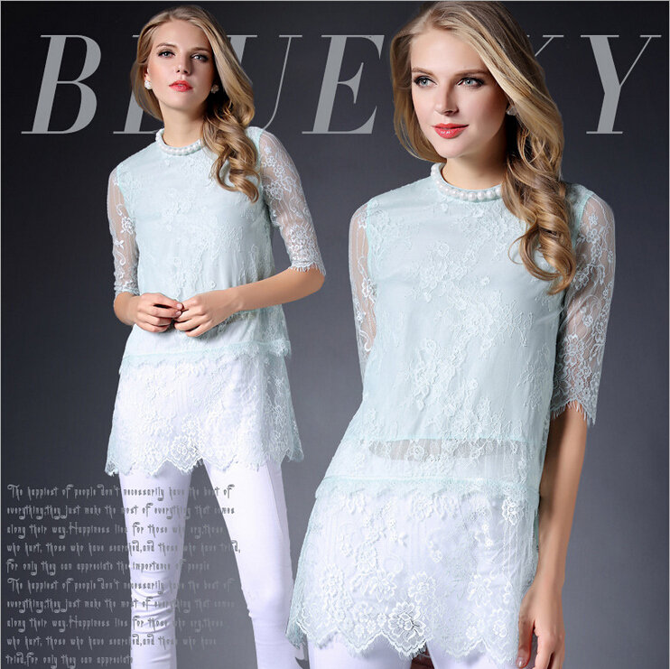 > 2015春装新款女装五分袖小衫中长款蕾丝衫女时尚显瘦修身上衣