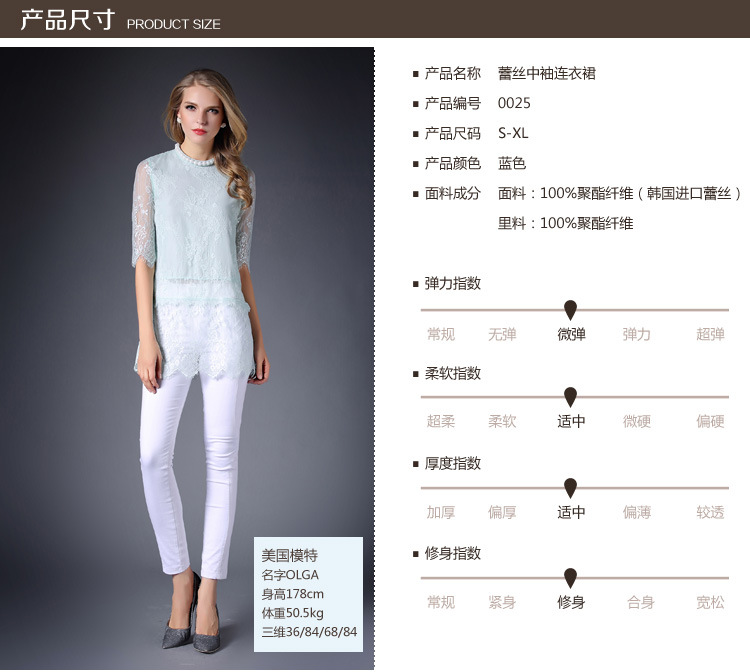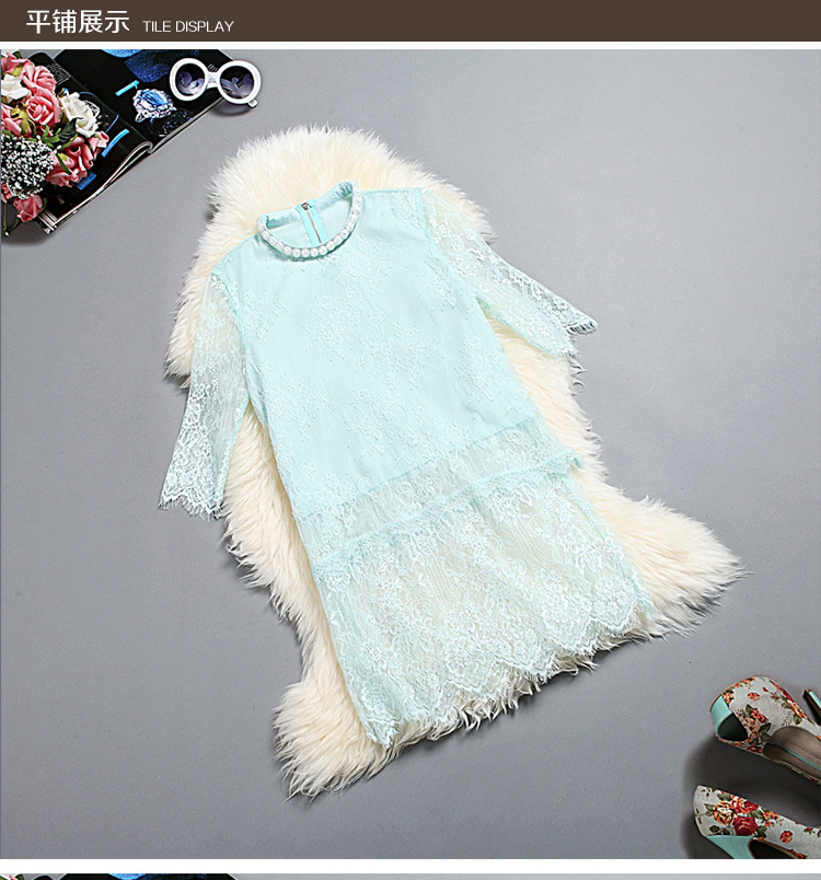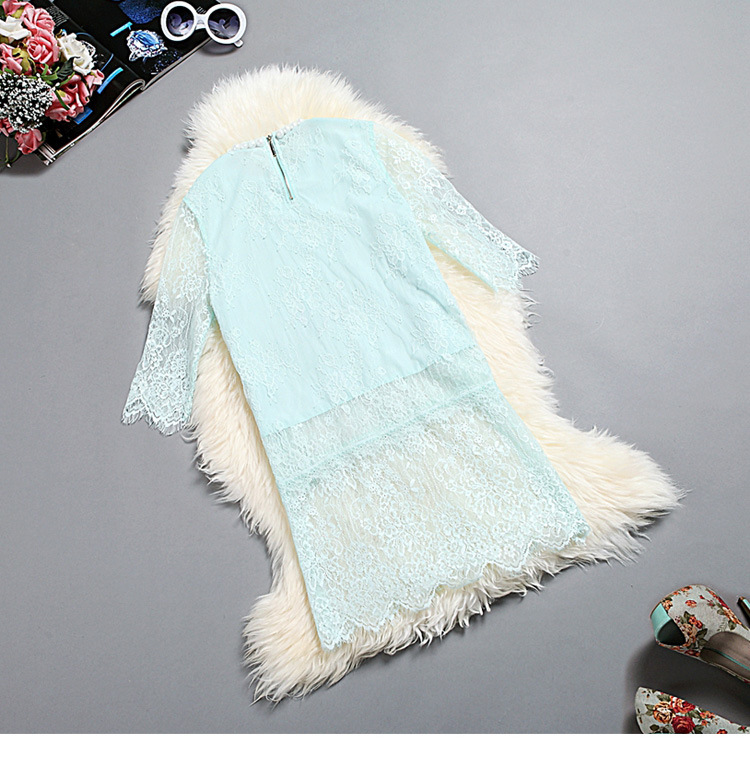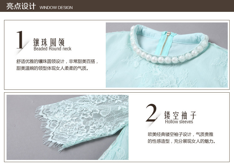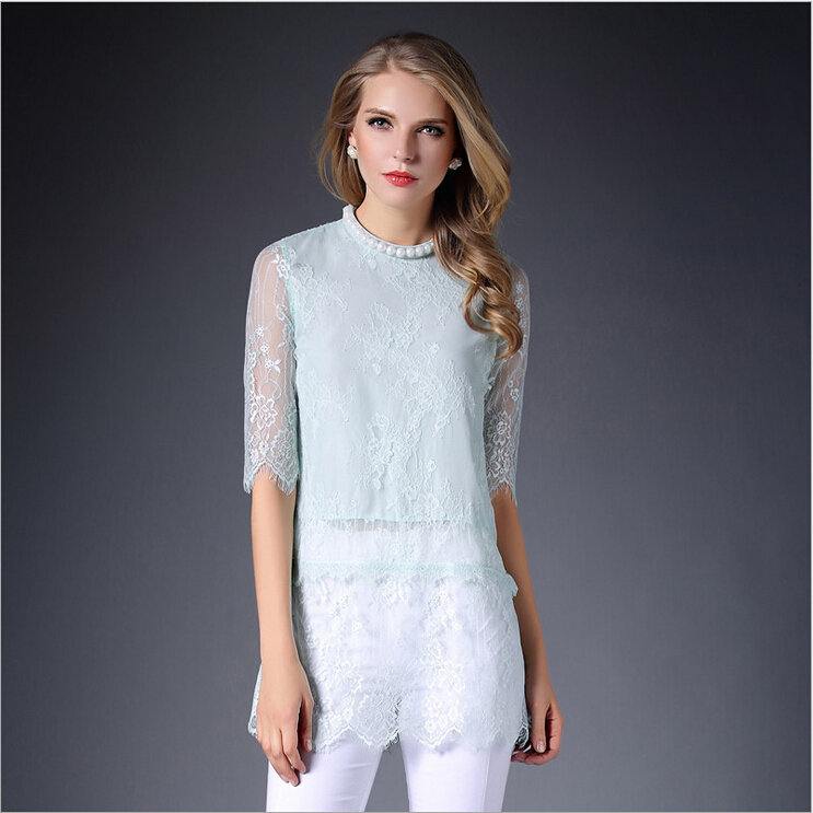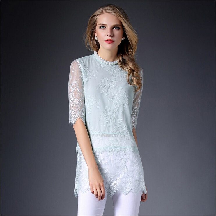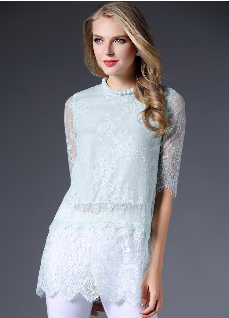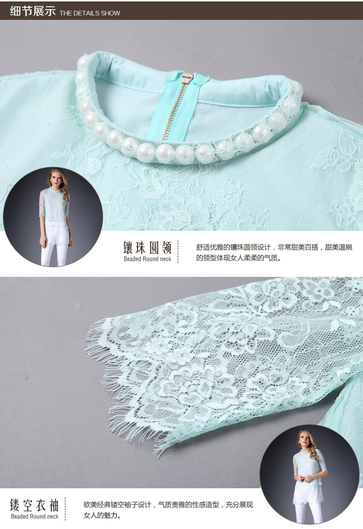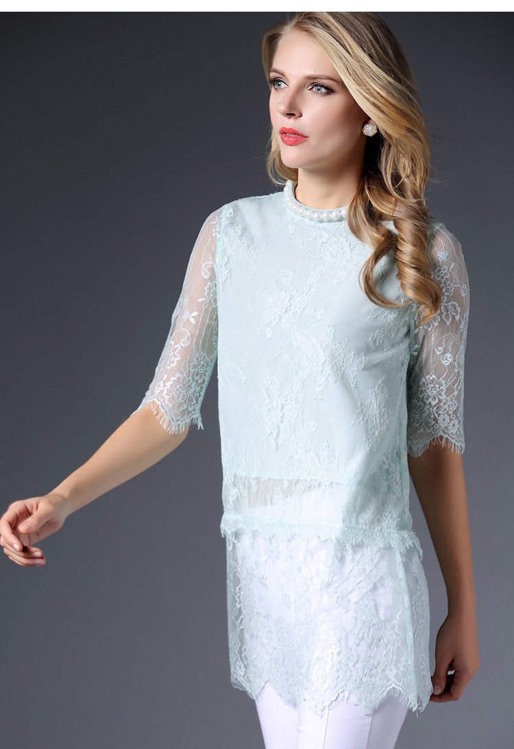 > 2015春装新款女装五分袖小衫中长款蕾丝衫女时尚显瘦修身上衣