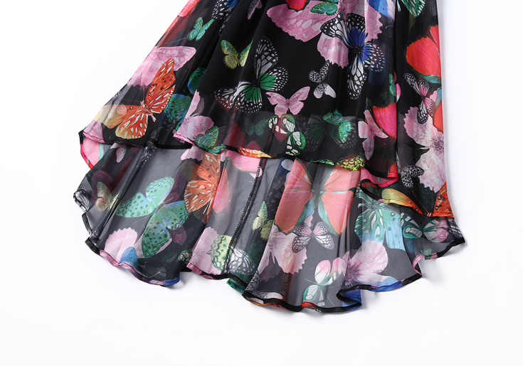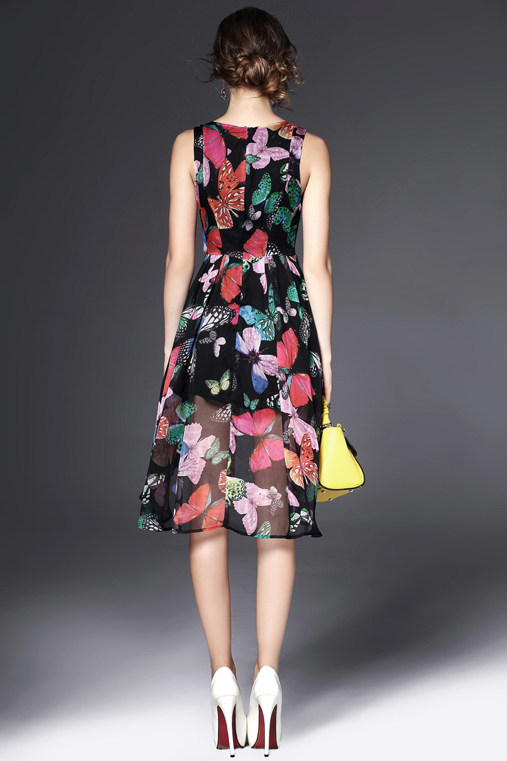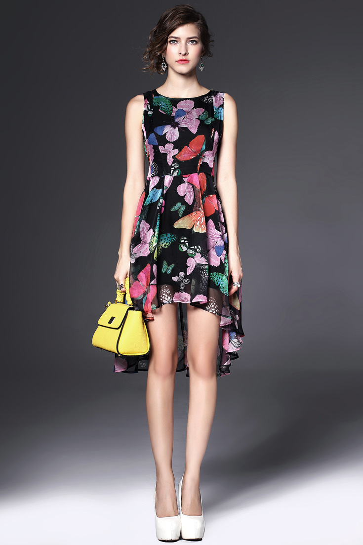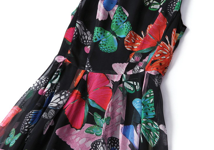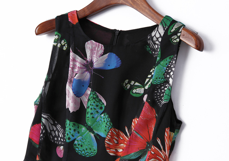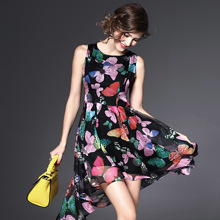 > 2015夏季新款女装欧美圆领无袖蝴蝶印花不规则下摆收腰修身连衣裙