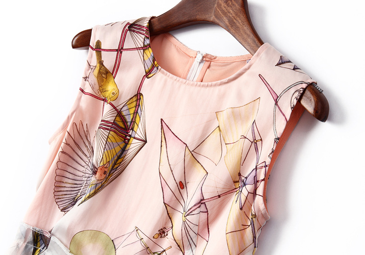 2015品牌女装夏季新款 圆领真丝欧根纱印花a字短裙无袖连衣裙