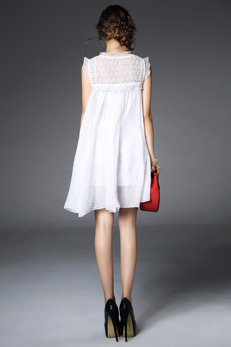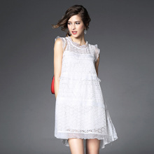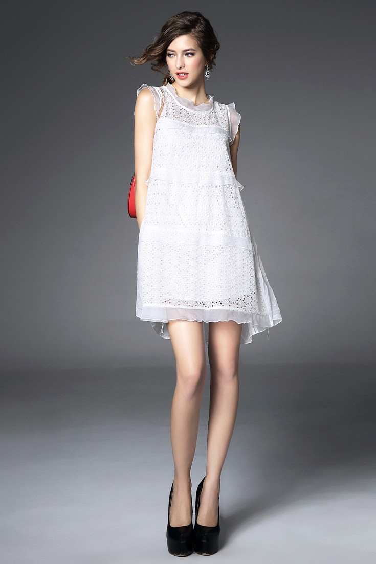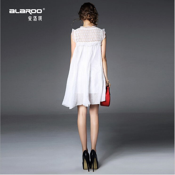 > 2015夏季新款 欧美大牌重工绣花镂空纯色荷叶边拼接宽松大摆a字裙