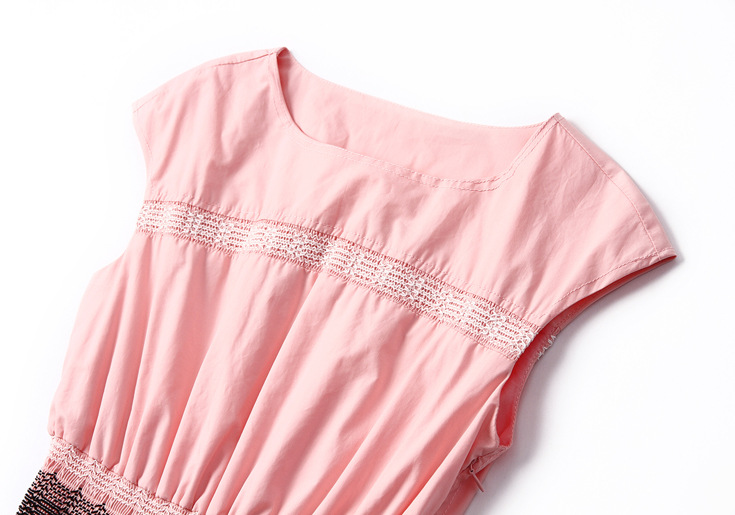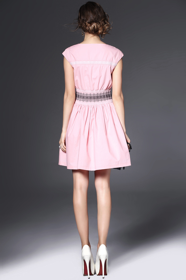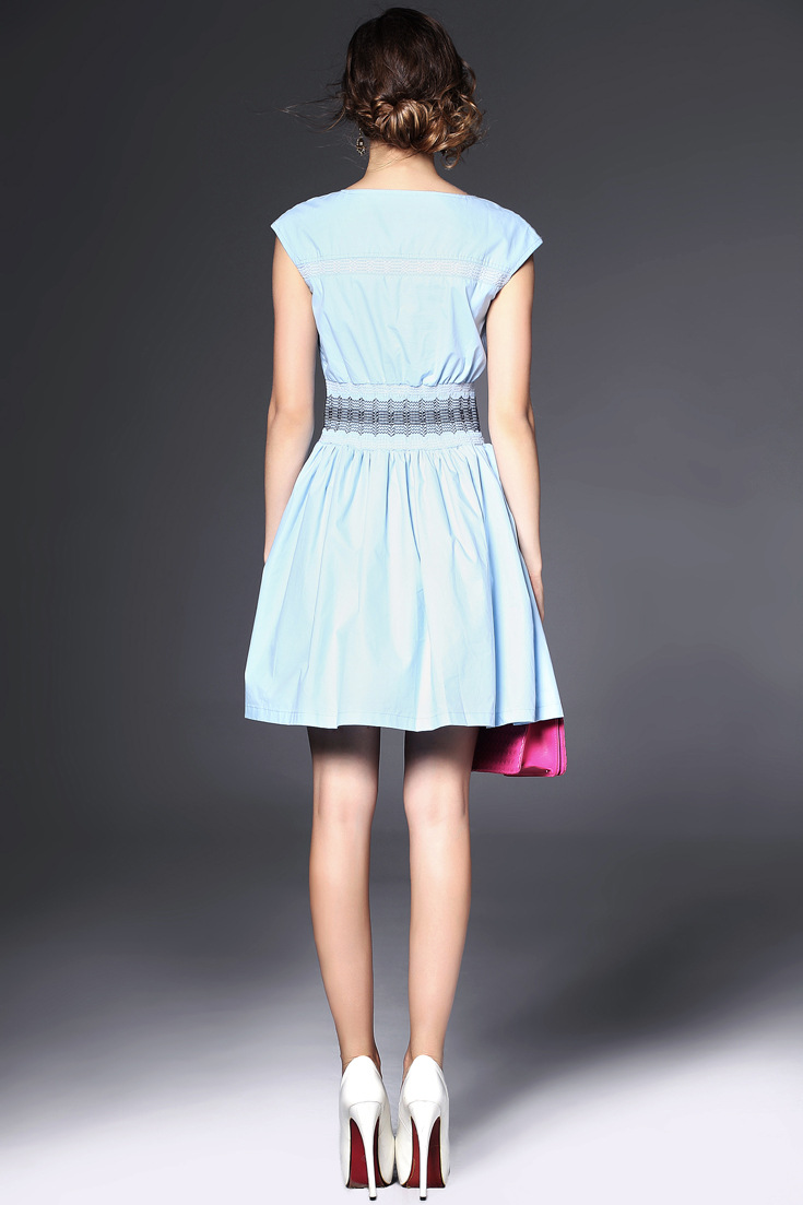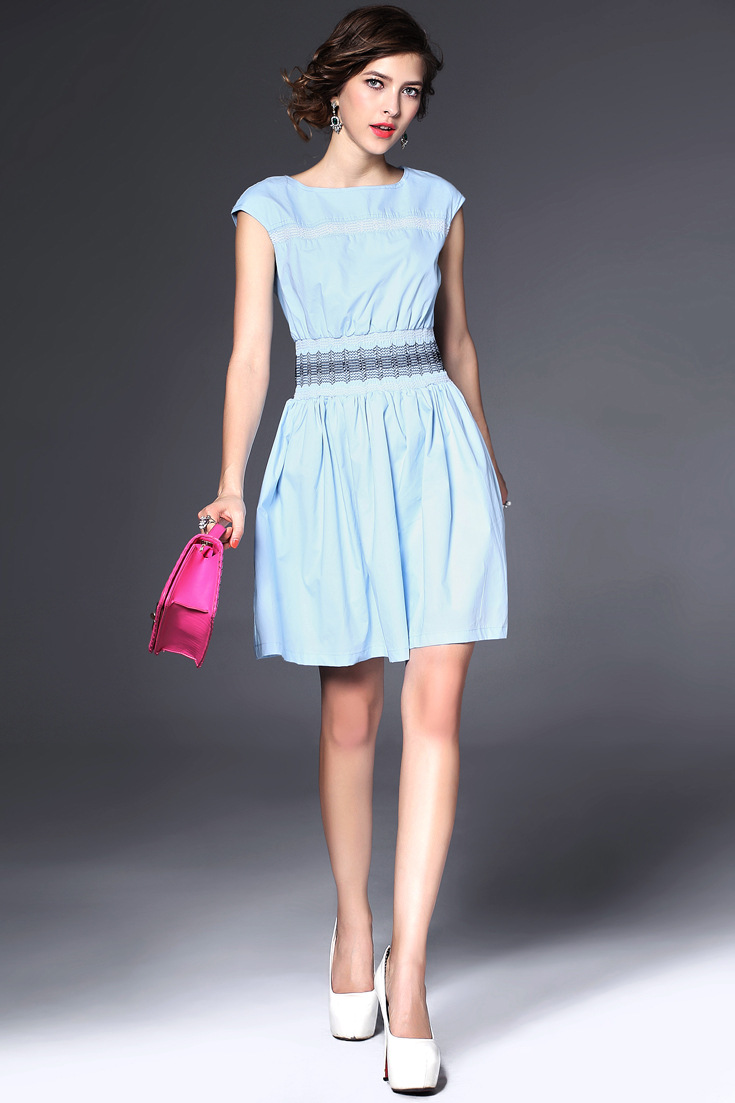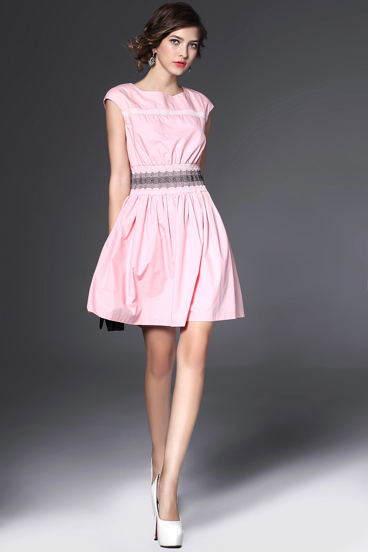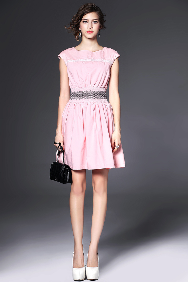 > 2015夏季女装新品 圆领压褶甜美纯色弹力收腰修身连衣裙