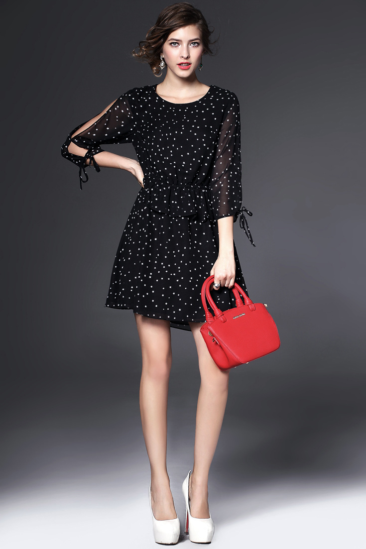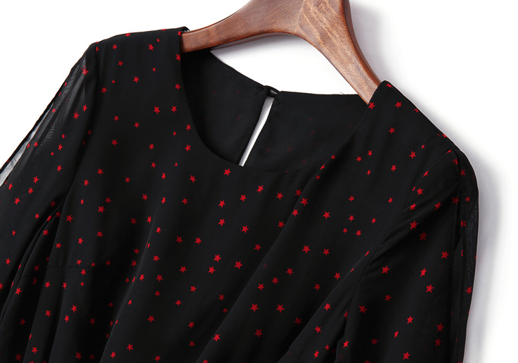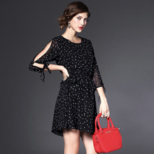 > 2015夏装新款 露肩袖星点印花优雅荷叶边修身雪纺连衣裙