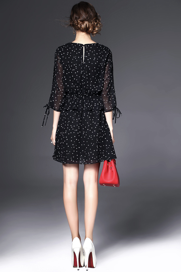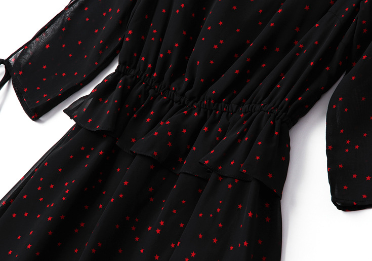 2015夏装新款 露肩袖星点印花优雅荷叶边修身雪纺连衣裙