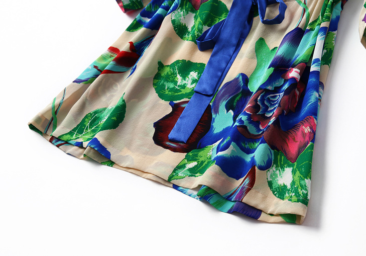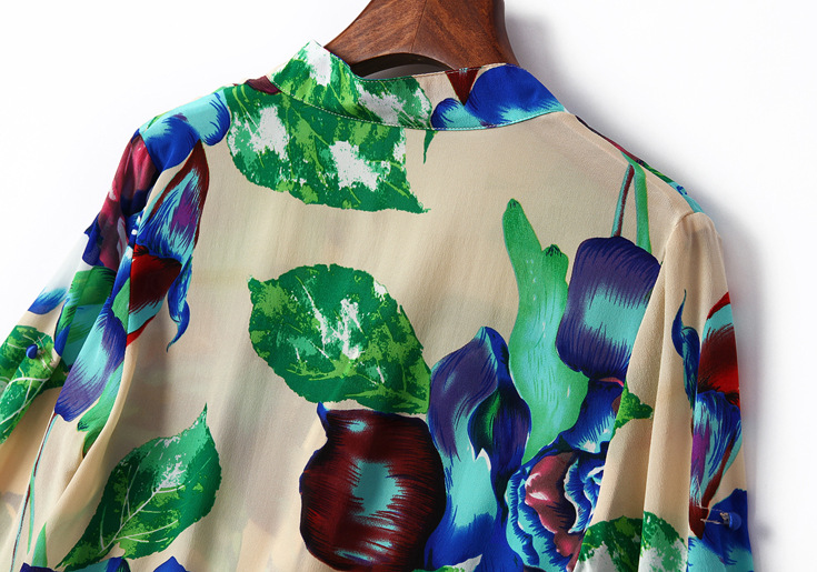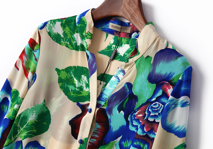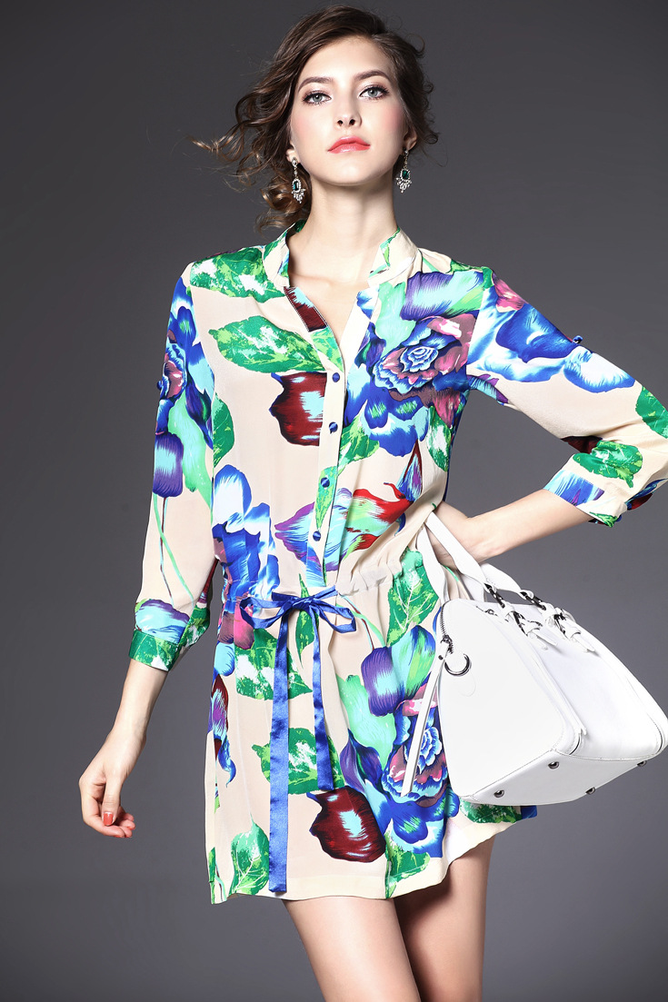 2015春夏季新款欧美风印花真丝连衣裙七分袖衬衣领时尚A字裙