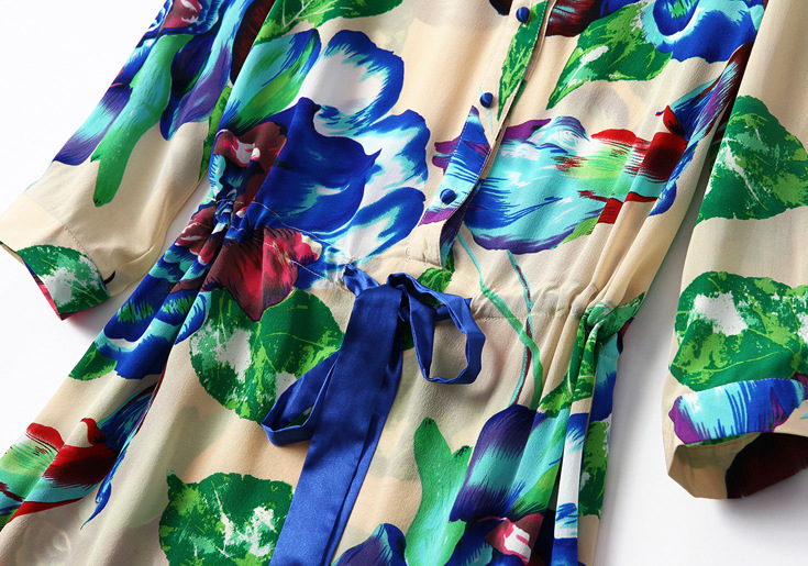 2015春夏新款欧美风印花高档桑蚕丝七分袖A字裙真丝连衣裙
