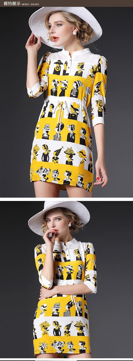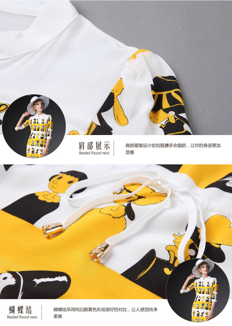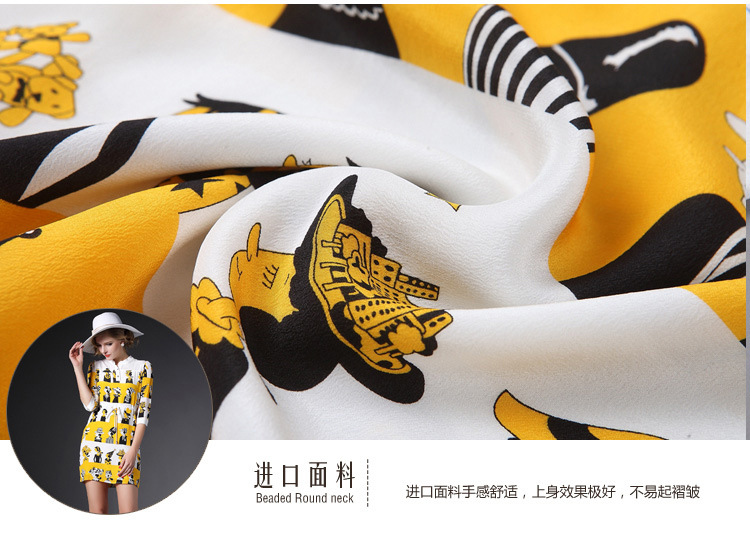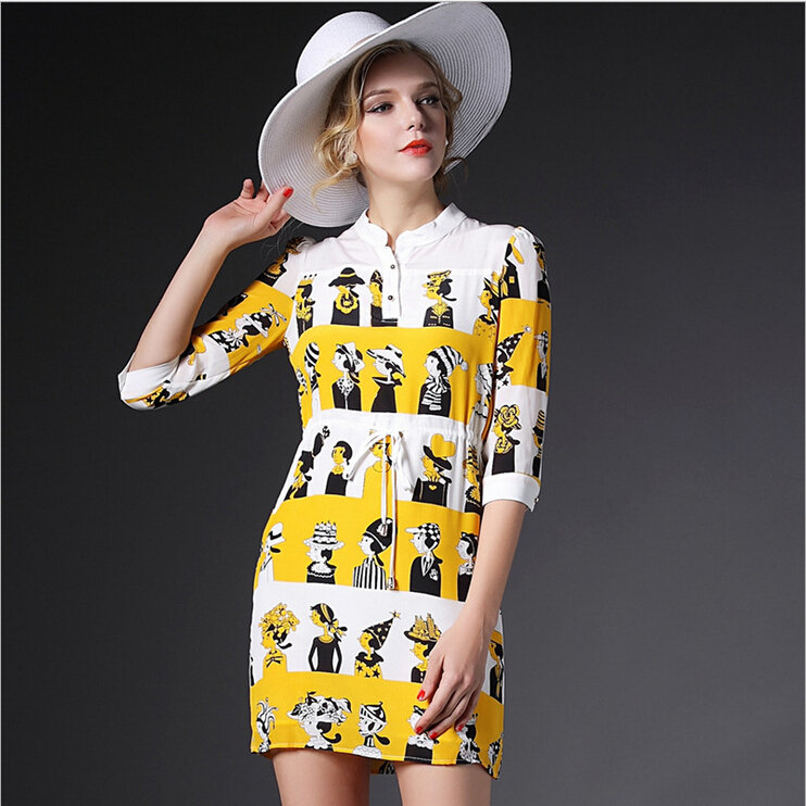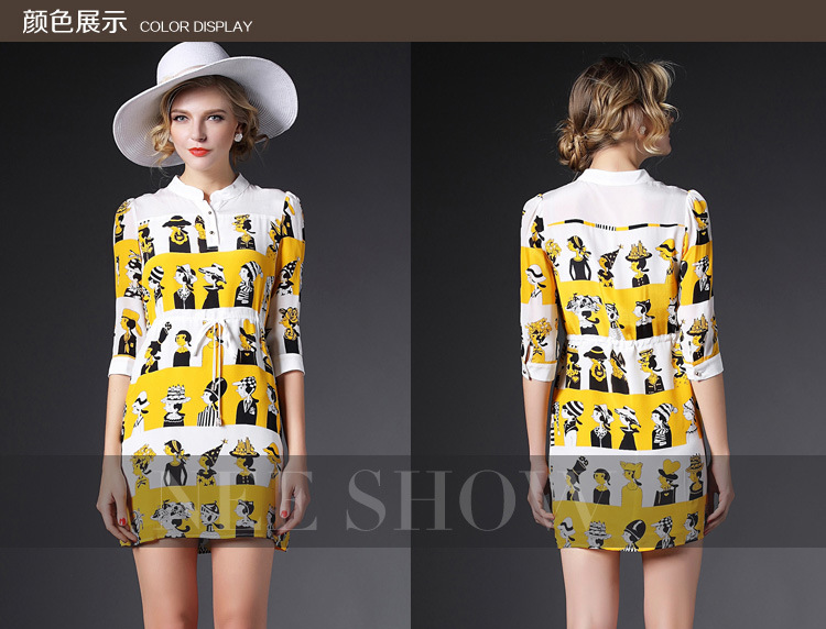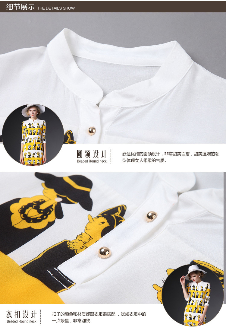 2015春夏季新款欧美风印花真丝连衣裙七分袖衬衣领时尚A字裙