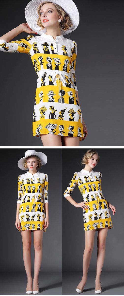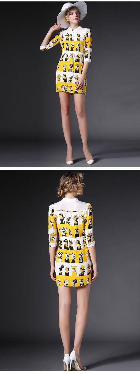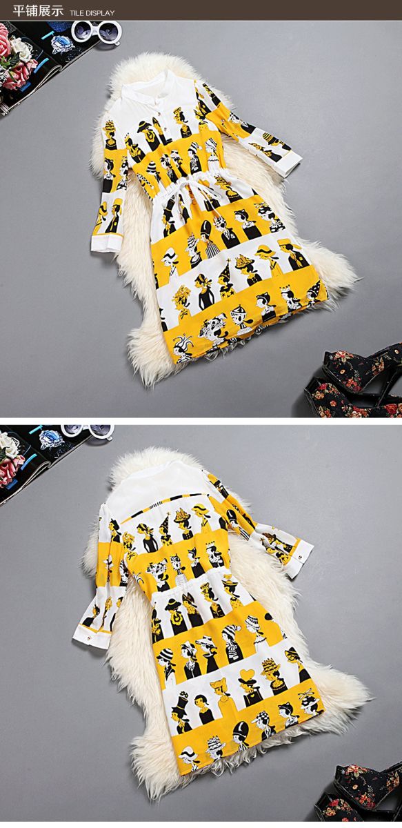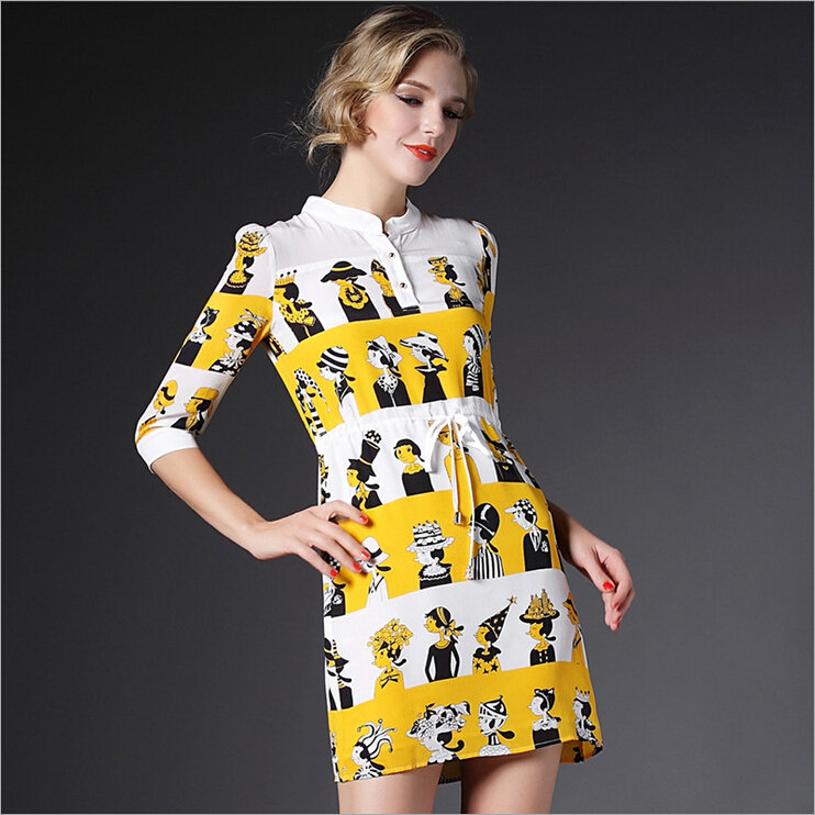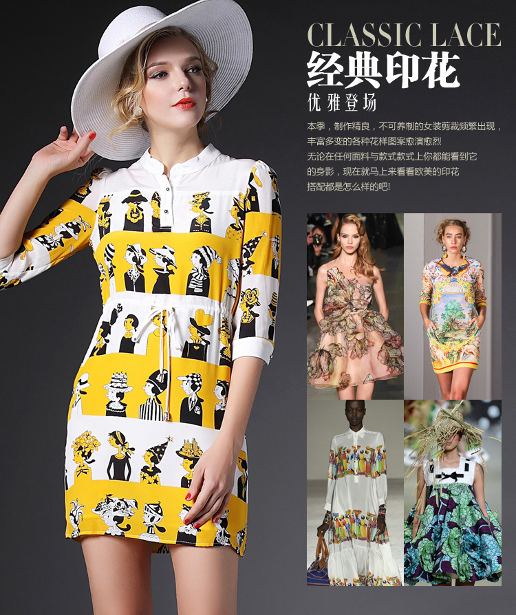 2015春夏季新款欧美风印花真丝连衣裙七分袖衬衣领时尚A字裙
