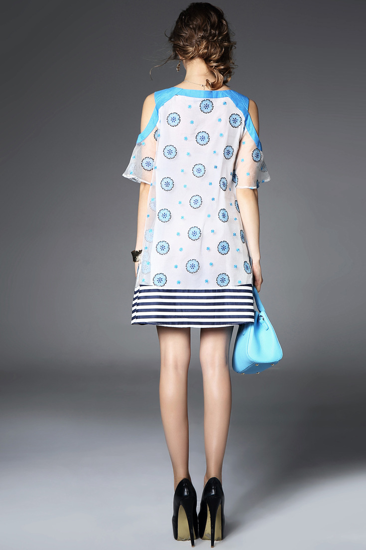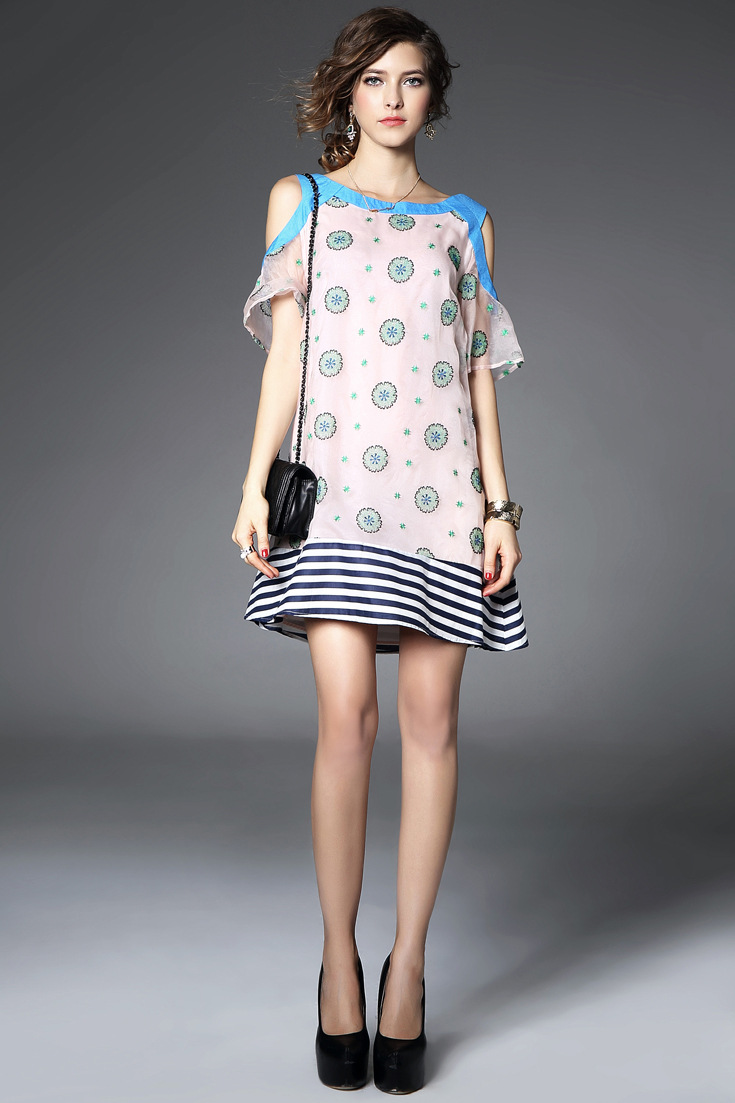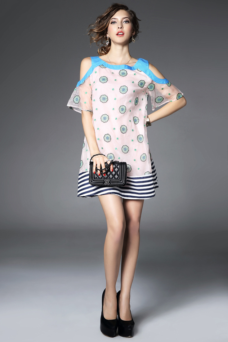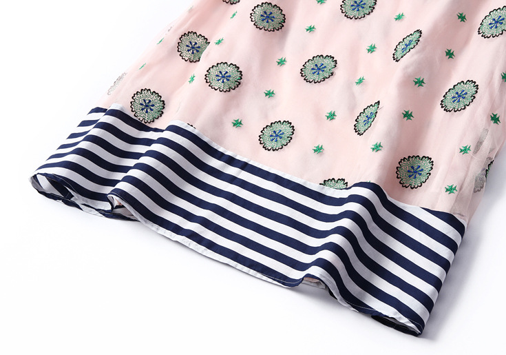 > 2015夏季女装欧美时尚露肩圆领重工绣花小碎花条纹拼接宽松娃娃裙
