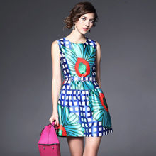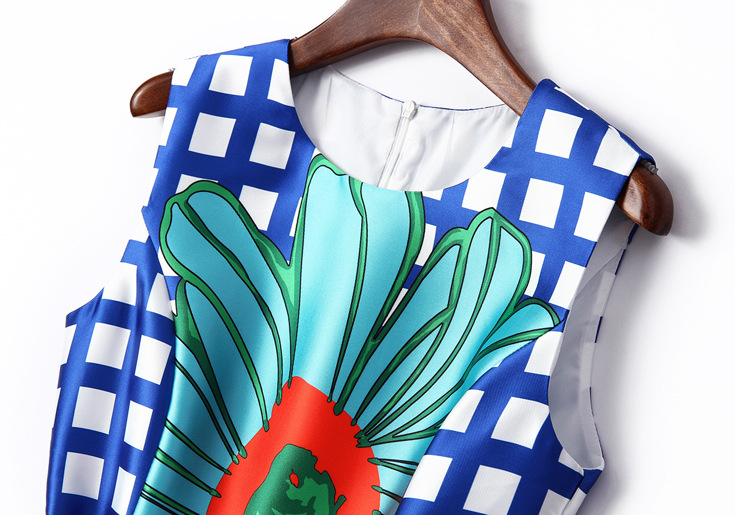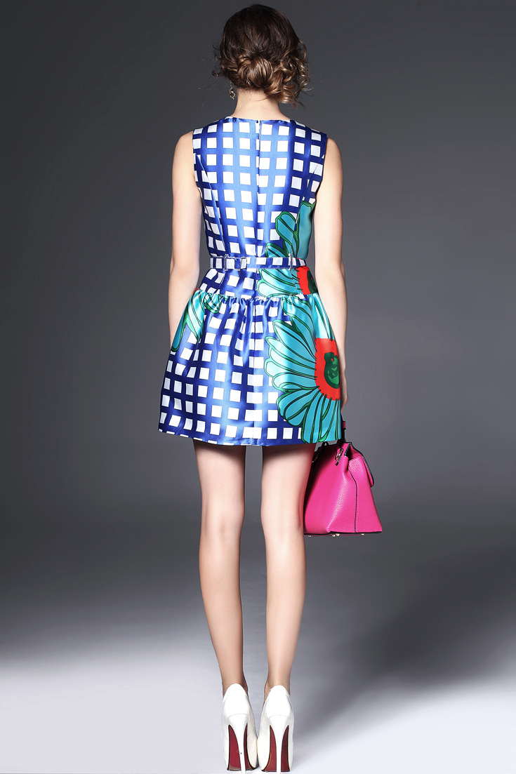 > 2015夏季女装新款 欧美圆领无袖方格印花修身收腰连衣裙