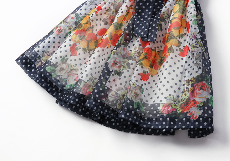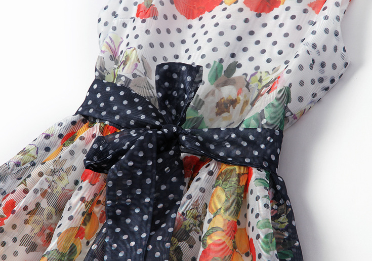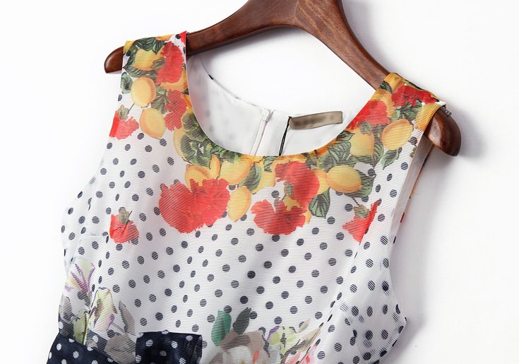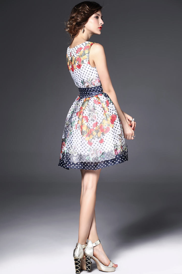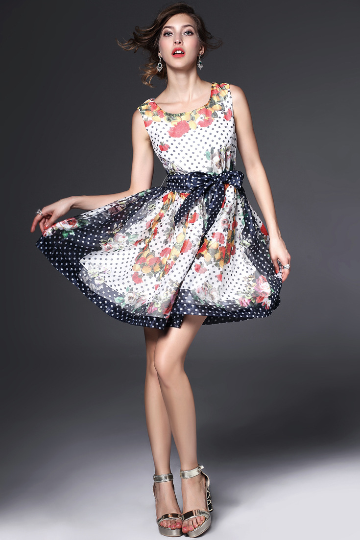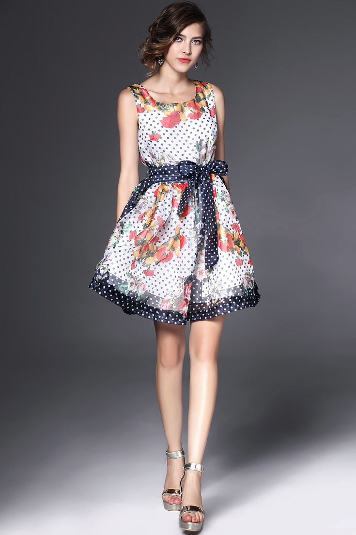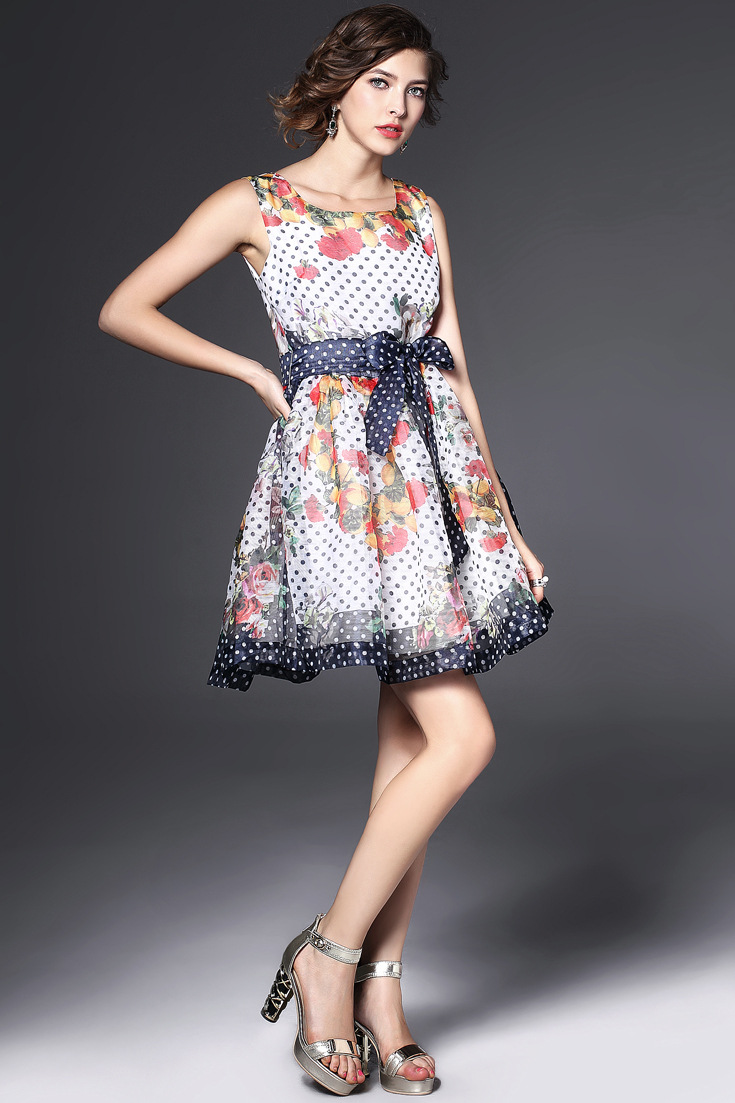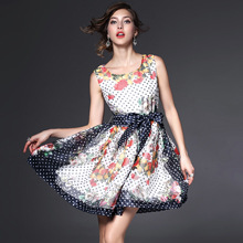 > 2015欧美女装夏季新品 无袖圆领波点印花系带收腰修身a字裙