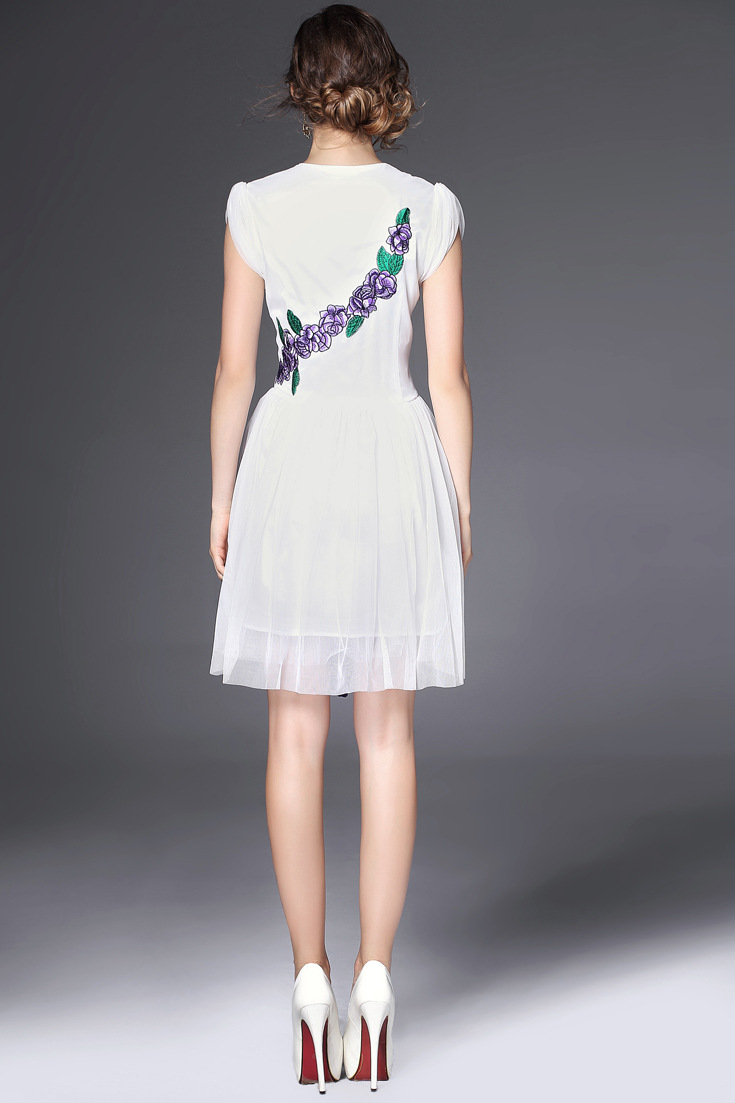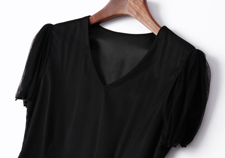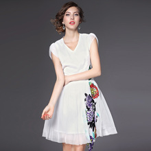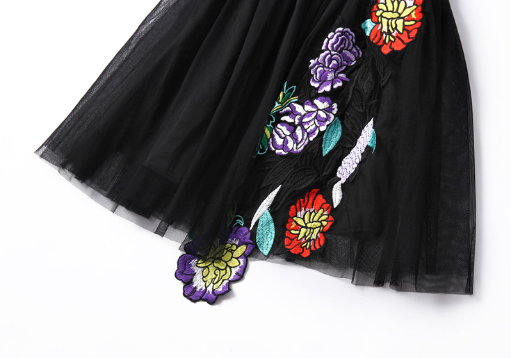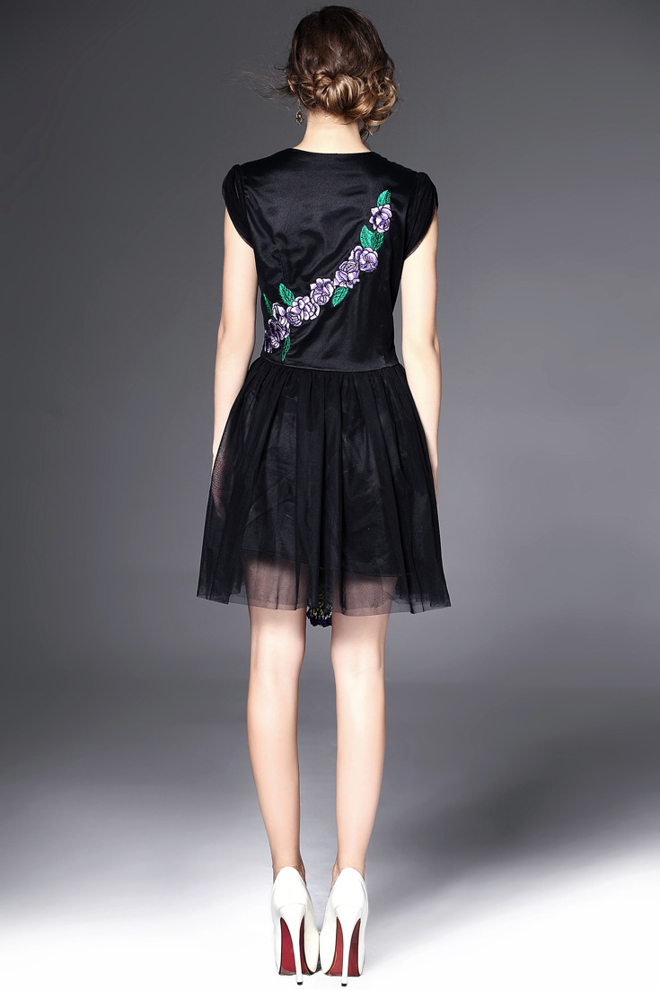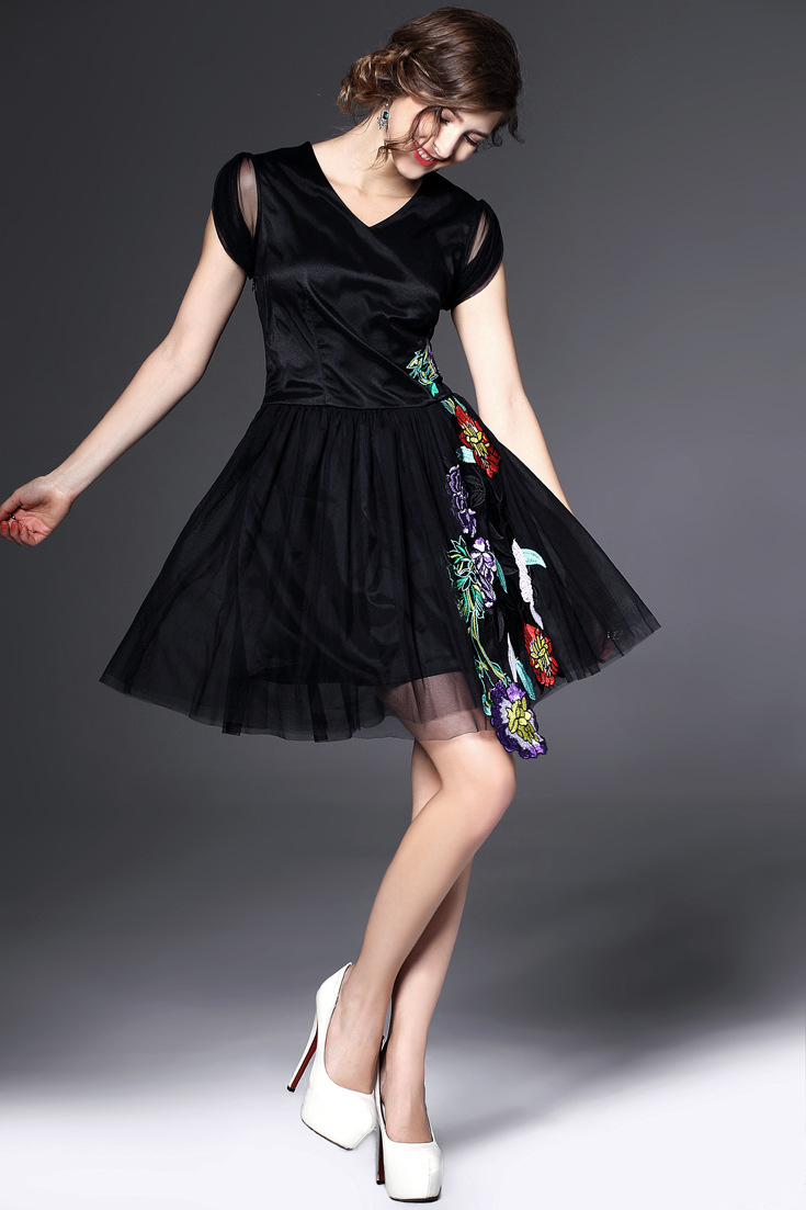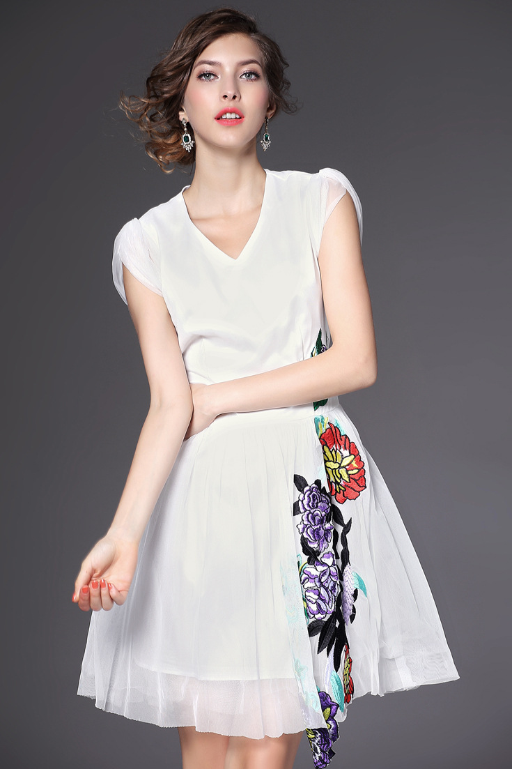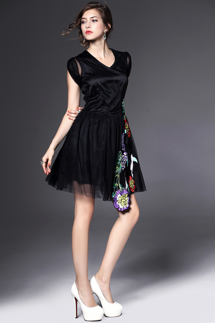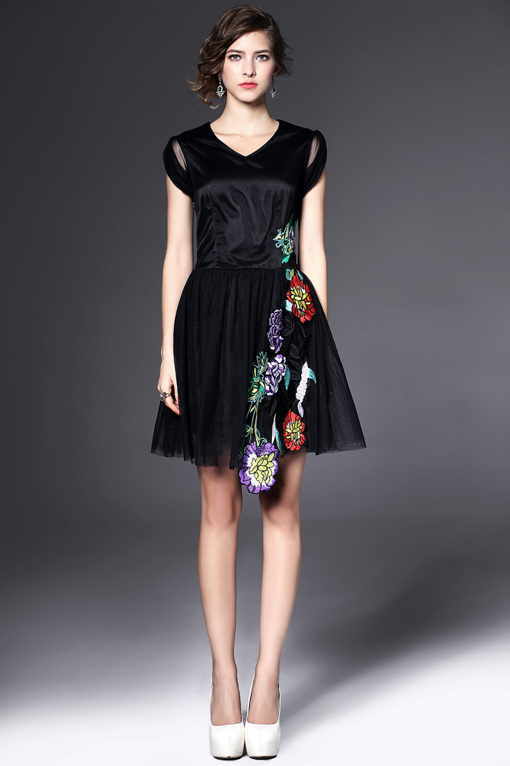 > 2015夏季新款 时尚v领包肩袖花朵绣花修身a字裙网纱裙