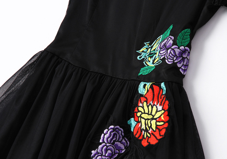 2015欧美风春季仙女裙气质新款刺绣网纱连衣裙七分袖大摆裙
