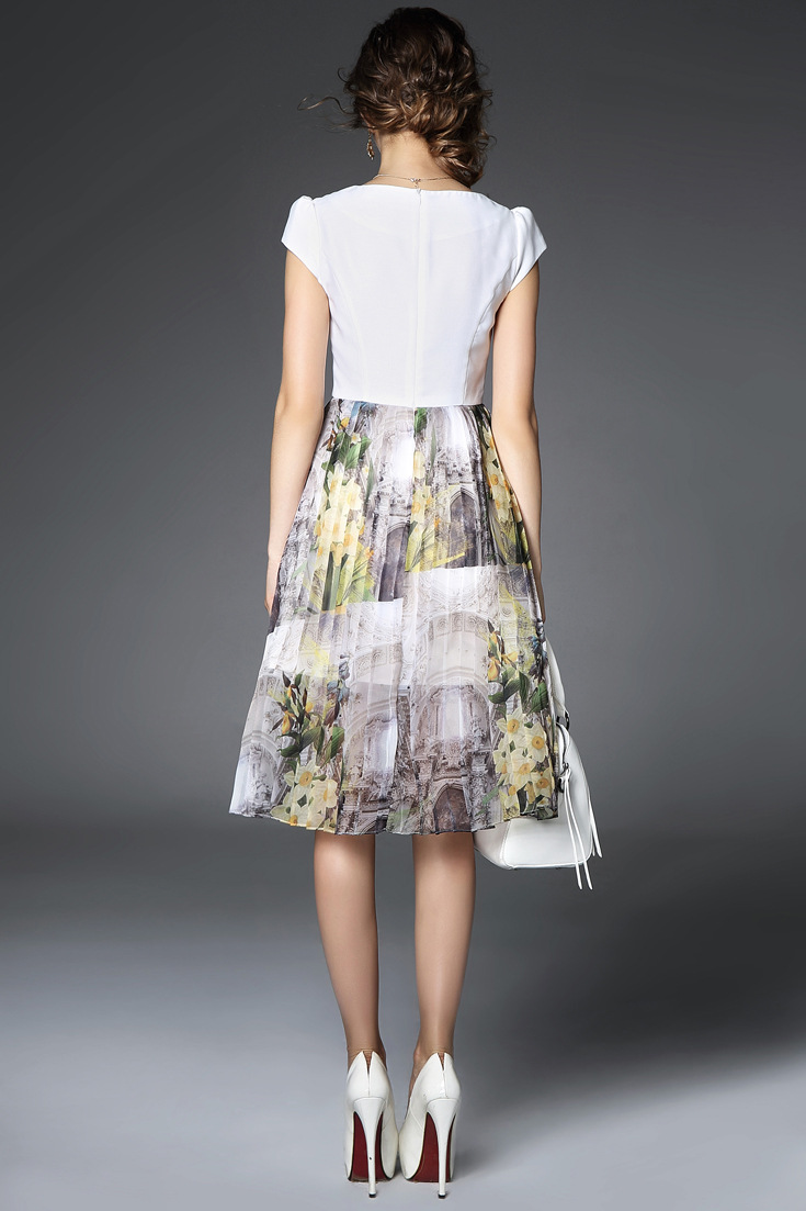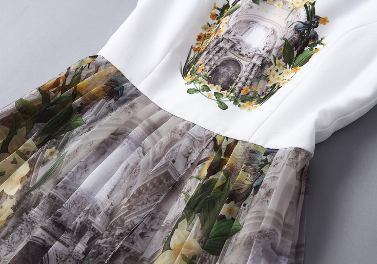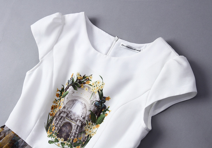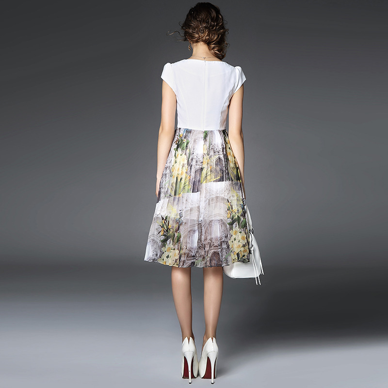 > 2015夏季新款 欧美时尚圆领包肩袖印花开叉压褶大摆连衣裙中长裙