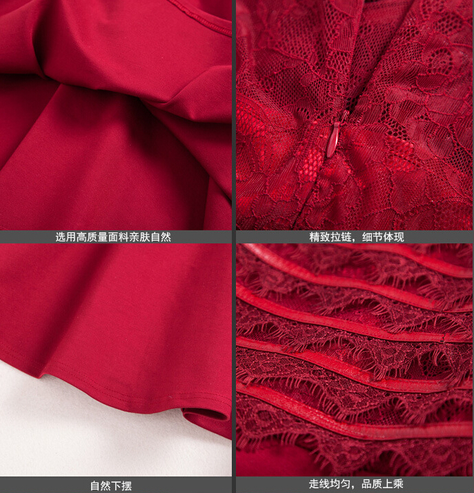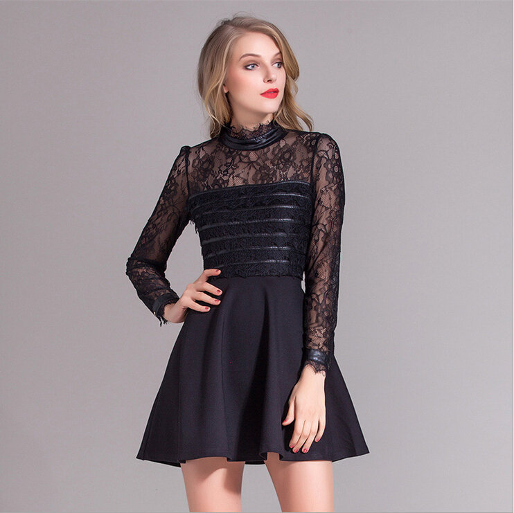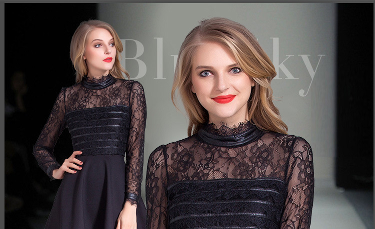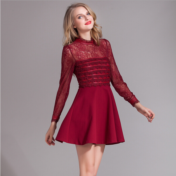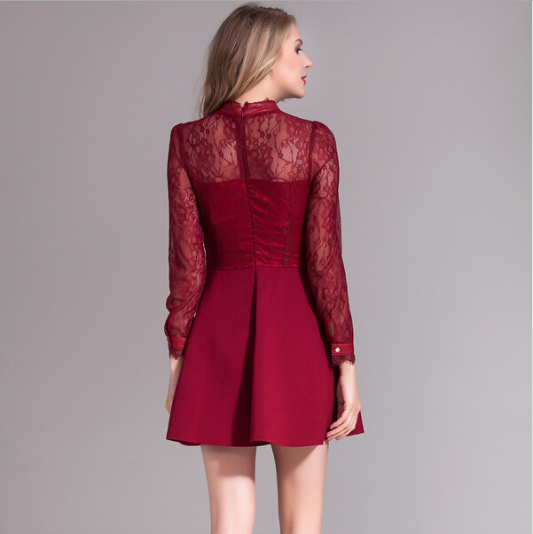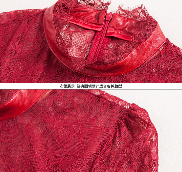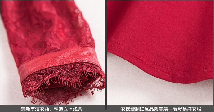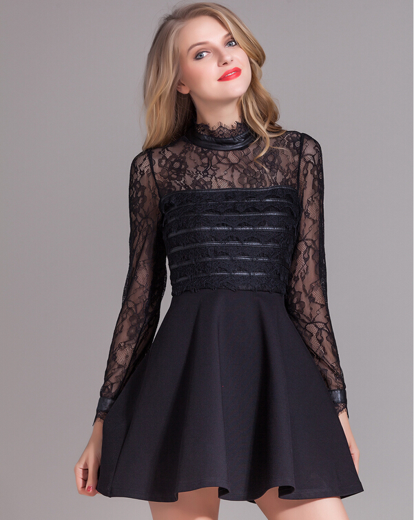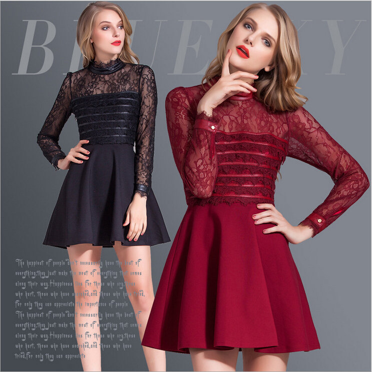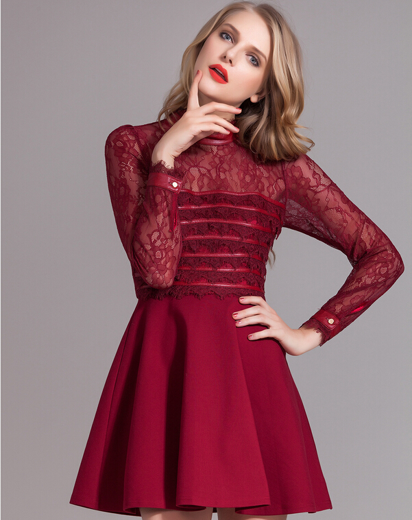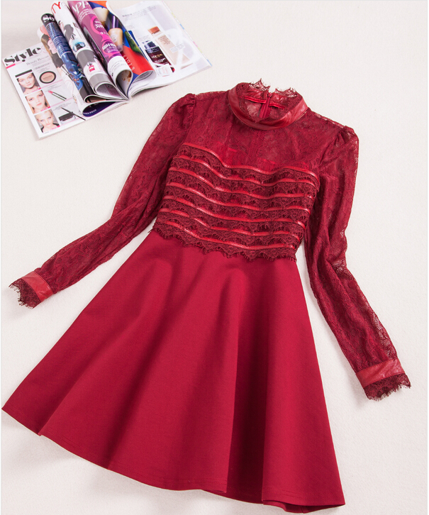 > 2015春装新款拼接修身蕾丝连衣裙女长袖高腰百褶裙